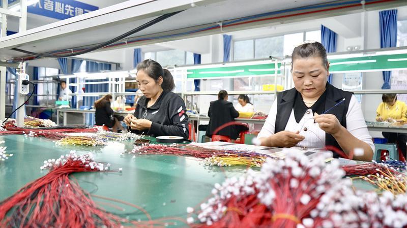 9月27日,走进位于安康市汉滨区谭坝镇松坝社区工厂二楼宽敞明亮的车间,工人们正熟练地进行电子线束生产流程的各项工作。记者 周恒宇摄 摸索 爬坡过坎渡难关 之所以选择开电子线束工厂,党信朋一方面希望发挥过去自己在电子厂工作积累的技术、管理和资源优势,一方面考虑到线束产业的市场前景和安康发展产业的现实情况。 线束被认为是各类电子产品的“神经网络”和“动脉血管”,使用场景多,需求量大。小到家用电表、智能门锁、摄像头,大到电脑、汽车、飞机内部的电控系统,都要用到线束。 不同于东部地区通江达海的优势,地处秦巴山区的安康物流运输成本较高。线束产品小而轻,运输对产业的制约较容易破解。 然而,投产一段时间之后,党信朋发现,在家乡搞工业生产的困难远比预想中多。 当时电子产品在安康尚属新生事物,原材料以及生产中用到的模具等产业链配套几乎一片空白,加上新社区工厂的员工刚由农民转为产业工人,不但生产效率低下,而且产品质量欠佳。 党信朋一边积极拜访本地和周边地区同行洽谈合作,采取设备共享、技术互助等方式,减少由于产业链不完善带来的生产障碍;一边钻研机械设备、自动化控制、模具和机械加工方面的知识和技术,努力把自己变成一个技术多面手。 面对山区专业人才招募困难,党信朋带领员工走出去学习。2018年至2019年他先后带领5批次员工到江苏、浙江、福建等地的大型电子企业,学技术、学工艺、学品质管理…… 2018年12月,党信朋一行5人从江浙企业结束学习返回,驾车走到河南、湖北交界处时,天空突然下起鹅毛大雪。路面打滑,车身也结了冰,一阵酸楚涌上党信朋的心头。 “花这么大代价出去学习,回家一定要教会更多员工。技术熟练的产业工人多了,工厂一定能成长和壮大。”党信朋感慨万千。 近年来,政府部门对新社区工厂的支持政策接踵而至,包括房租优惠、水电费减免、技能培训补贴等。渐渐地,党信朋的公司步入发展“快车道”,到目前已有150多名员工,其中专业技术和管理人员15名。