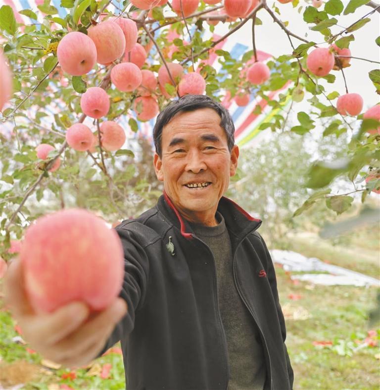 张延刚展示辛户村苹果。 “砍掉果树收入会减少吗” ——从56株减到28株,再到14株,每亩果园平均收入逾3万元 怎样种出好苹果,是张延刚每天都在琢磨的事。 机会来了。2005年,张延刚跟随省果业局到日本学习苹果种植技术,他感受到科学种植的魅力,更坚定了开展“果树革命”的信心。 剪枝!回到村里,张延刚果断作出决定。 “果树好不容易枝繁叶茂了,要剪枝,这是什么道理!”村里人琢磨不透。“修剪果枝后,可以培养树形,产好果子,苹果能卖上价。”张延刚耐心劝导大家。 凭着对张延刚的信任,群众还是愿意试一试。 剪枝后,2007年,辛户村的苹果不仅个儿大、品质好,产量还提高了50%,价格翻了一倍。村民心里乐开了花。 间伐!第二年,张延刚又提出将果园“密改稀”。“砍掉果树收入会减少吗?”尽管心存疑虑,但群众仍然将每亩果树从56株减到28株,再到14株。最终的结果打消了大家的疑虑:优果率由间伐前的60%提高到92%,树龄也可从25年延长到50年。 种草、滴水灌溉、施农家肥、果畜结合……张延刚带领村民采取一系列措施,增加果园土壤有机质含量,改善果园小气候,为苹果生长创造最佳环境。 一个党员就是一面旗帜,一个支部就是一个战斗堡垒。一支懂农业、爱农村、爱农民的“三农”工作队伍,为辛户村产业发展提供了坚强的保证。 注册“云辛”品牌,兴建气调库,建果筐厂,成立云辛果业专业合作社,由村合作社统一定价、抱团销售……辛户村苹果产业迈出高质量发展的步伐。 2013年,辛户村每亩果园平均收入超过3万元,人均收入突破4万元,收入最多的农户人均超过10万元。 看到了希望,多年前外出打工的村民纷纷“归巢”。