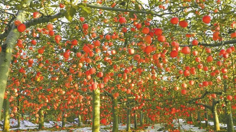 辛户村果园近景。 “苹果能当饭吃吗” ——种苹果后,全村人均年收入超过5000元 “在县里工程队干得好好的,怎么要回村?”1989年,20岁的张延刚年收入一两万元,他的回村决定让亲戚朋友很不解。 “村子再穷,那是我的根。”张延刚说。当年辛户村换届选举,张延刚被群众推选为村委会主任。上任后,张延刚为群众办成3件大事,解决了吃水、照明和修路问题。 勤劳的农民辛苦耕耘,却始终难以摆脱贫困:全村耕地亩均收入不足200元。 “你们那儿海拔高、光照足、土壤肥沃、昼夜温差大,是苹果的最佳优生区!”1992年春天,张延刚与村委会成员外出考察,农业专家纷纷建议。 “种苹果!”经过深入研判,村委会作出决定。 “苹果能当饭吃吗?”许多人质疑。 入户做工作,承诺村里提供服务,组织村民外出看果园……“卖不上钱,我负责!”张延刚立下“军令状”。 很快,辛户村两委班子带领村民栽下200亩苹果树苗,并承诺10年免交土地承包费。 1998年,敢于先试的18户村民尝到了种苹果的甜头:一亩地收入2000元,是种粮收益的10倍。巨大的收益,点燃了辛户村人种苹果的热情。 1999年,党中央、国务院启动退耕还林工作,在延安提出“退耕还林、封山绿化、个体承包、以粮代赈”的十六字方针。退耕还林为辛户村发展苹果产业带来了新机遇。 在政府的指导下,辛户村调整产业结构,在山峁沟岔间平整土地1700多亩,并全部改造成苹果园。辛户村人开始在这场由黄到绿的巨大转变中摸索致富路。果树一天天长大、结果,群众收获了丰收的喜悦,张延刚收获了群众的信任。 2005年,张延刚当选辛户村党支部书记。辛户村当年人均收入超过5000元。