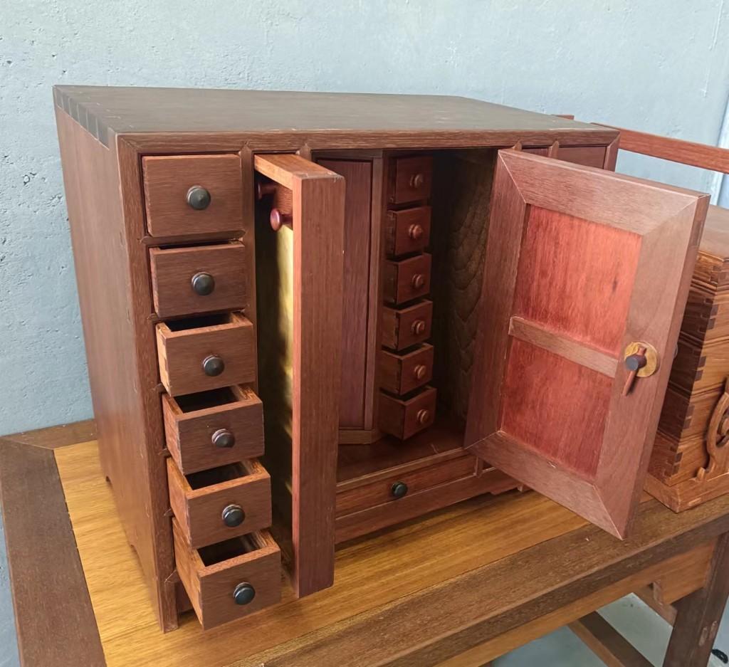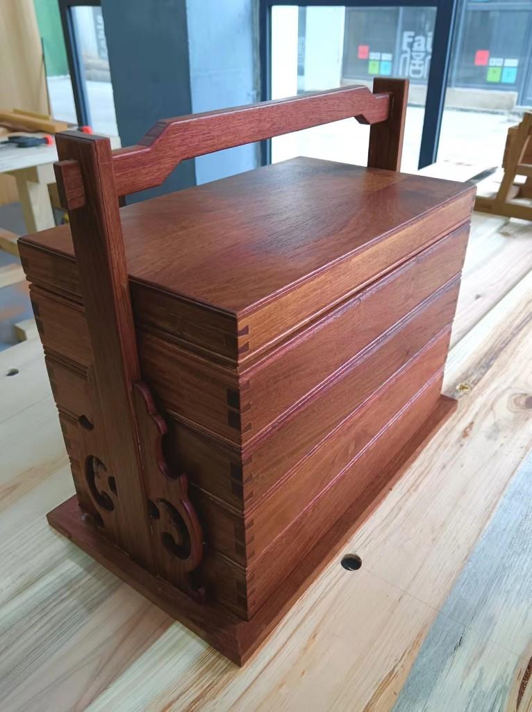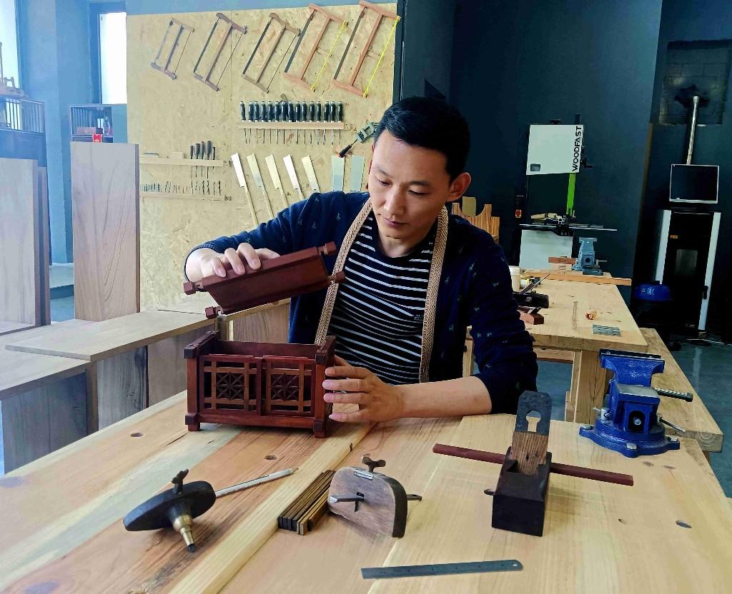 2017年,戴朝禧被选派参加中央电视台《技高一筹》等栏目,还受邀参加故宫修复工作。专家、大师们的精湛技艺、故宫里众多的木制艺术珍品,都让他受益匪浅。其中,仅存于故宫的方角药柜尤其精妙。“要让更多的人看到木工艺术珍品!”他萌发了这个念头。 离开故宫后的400多天里,戴朝禧废寝忘食,反复构思、计算,向老师请教,攻克了多个技术难题,终于成功复制出方角药柜,并稍作改动,做成了微缩版的首饰柜,增加了实用性。 “那一年多,我满脑子都是方角药柜,只有累得睡着了才不想!”戴朝禧乐呵呵地说。他用红檀木制成的方角首饰柜,长、宽、高40厘米左右,长方形的外柜有门和抽板,内嵌的八角形套盒旋转自如,里外有39个抽屉,有的只有火柴盒大小,构造巧妙、精致典雅。 首饰柜获得众多收藏大家的喜爱。有人曾出价10万多元意欲收藏,戴朝禧却一口回绝。“我只是想用它展示木工榫卯非遗文化,没有考虑过挣钱!”他道出了初衷。 2018年,戴朝禧学艺结束,获得了手工木工高级证书。当年和他一起拜师学艺的160多人,坚持到三年后毕业的只剩下他和另外4个人。毕业后,他就职于天津职业大学艺术系木工坊,从事教学工作。2020年,戴朝禧被佛坪县确定为招才引智对象之一,他和佛坪籍的妻子一起回到了故乡。 “我们要搭建好平台,让人才更好地发挥才能,促进非遗传承和文旅融合!”袁家庄街道党工委书记桂鑫乐说。佛坪县文旅局聘用戴朝禧从事传统榫卯文化传承和中小学研学工作,袁家庄街道提供房屋、水电等设施,并给予补助,帮助他打造了曲尺坊木工学堂。