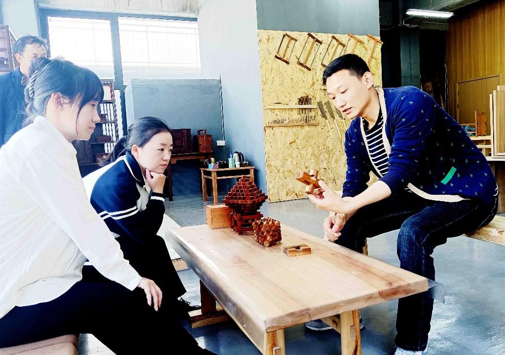 “榫卯工艺是古代木工工艺的灵魂,集力学、几何、美学于一身,把在木头上凿出的凸出、凹进的地方,分别称为榫、卯,凭凹凸部位连接制成家具。”戴朝禧讲解着榫卯工艺,说起了他的木工梦。 1987年,戴朝禧出生在河北省乐亭县一个农民家庭。小时候他就喜欢木工,村里谁家请木匠做活,他都要跑去看。表叔是镇上有名的木匠,他缠着表叔要拜师学艺,表叔却不答应,他就在上学之余求教别的木匠。2008年,从河北省廊坊体育运动学院毕业后,他曾就职于中铁二局从事安检工作,收入稳定,但仍终非所愿。 2015年2月,得知天津市榫卯非物质文化遗产传承人辛全生大师正在收徒,28岁的戴朝禧不顾全家人的反对,毅然辞去工作,来到天津拜师学艺。“学艺很辛苦,我坚持下来了!”戴朝禧说。 辛全生大师对学生要求严厉而苛刻。刚开始的两个月里,戴朝禧忍着寒冷,天天拉锯子锯木头,直到锯的木条上看不到划线了,大师才让他练习用刨子把木头刨成直角状。 长达数月的枯燥练习和体力劳动,有的人已经放弃了学习,戴朝禧的双手也打起了血泡,胳膊酸痛、疲惫不堪。一次,他把木头少刨了厚度,偷偷把直角尺折弯了一点,刨制的木头算是“直角”了,被大师发现,严厉地责罚了他。 “这件事,让我知道了学艺来不得半点虚假!”戴朝禧说,从此他毫不偷懒、刻苦学艺,甚至整夜不眠不休,成功解密鲁班锁,在学徒中脱颖而出。