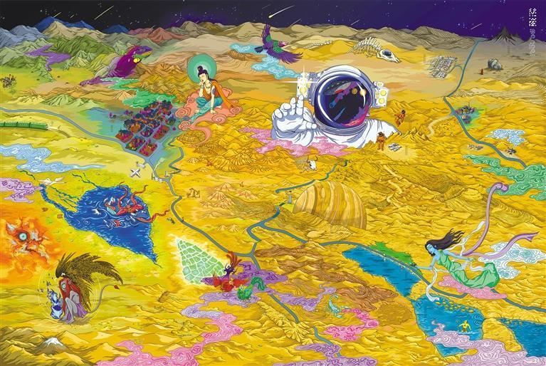 卫东青手绘作品《茫崖》。 回到西安后,卫东青立即着手“手绘西安”的准备工作。他要把整个西安城都画在一张图上,让世界各地的游客能直观明了地看到西安丰厚的文化资源和人文景观。 然而,想起来容易,做起来却不那么简单。 两年中,只有投入,没有收入。卫东青要想办法为创作团队支付工资,想办法筹集创作经费。城墙是西安的标志,也是画好“手绘西安”的关键。卫东青带领团队先后多次登上城墙写生取景,每次光门票就要花去数百元。困难面前,他没有退缩。然而,当一年后卫东青画完以城墙为主体的主图时,身心疲惫的他有点犹豫了。他不知道这样的付出会不会有回报,是否值得。妻子薛云丽对他说:“这是你这些年来干得最有价值的一件事,为什么要放弃?” 在妻子的鼓励下,卫东青坚持创作。他先后七易其稿,每幅草图都有一面墙大,几乎把西安城所有能展示的地方都画了上去。在草图的基础上,他和创作团队反复研究、修改取舍,最终的定稿上呈现了包括城墙、大雁塔、钟楼等在内的110多处历史文化遗迹以及现代标志性建筑,“忒色西安”一目了然。在组图的背面,他们还言简意赅地对主要景点和地标性建筑进行了介绍。 为了搜集素材,卫东青两年中跑遍了西安城的每一处景点、每一个街巷、每一幢标志性建筑,拍照、速写,反复对照取舍。在西安的大街小巷走了多少天,走了多少遍,卫东青已经记不清楚了,但他清楚地记得几个数字:照片拍了10万多张,速写手稿画了2792幅,整卷作品完成历时769天。 2012年4月,这份最终取名《忒色西安》的陕西首个严格意义上的手绘地图正式出版,一经上市便受到游客喜爱,引起全国各地媒体的广泛关注。多年来,《忒色西安》反复印刷,发行量已超过30万册,并漂洋过海,受到国外友人的欢迎。 “《忒色西安》不仅仅是一个文创项目,不仅仅是一张西安手绘图。我觉得这么多人喜欢它,更多的是因为它承载了大家对这座城市的深厚情感和记忆。”卫东青对记者说。 挚爱 让脚步更加坚定 2018年8月6日,西安市旅发委向辖区各景点、景区推荐使用《忒色西安》,指出忒色西安系列手绘图特色鲜明、内容丰富、绘制精良,是不可多得的艺术精品,是宣传西安的特色地图。 之后,卫东青带领团队开始系统介绍陕西的文化古迹和人文特色,连续创作了《忒色陕西》《回坊上》《咥在西安》《广仁寺》《溥彼韩城》等作品,视野更加开阔。 在《咥在西安》中,他把羊肉泡馍、羊血饸饹、肉夹馍、臊子面、凉皮、水晶饼等陕西名小吃,用手绘的形式一一进行了精彩展示,尽可能全面地向世人介绍西安的美食。《咥在西安》深受广大游客欢迎。此外,《忒色陕西》对陕西的历史人文景观和景点等进行了集中解读。