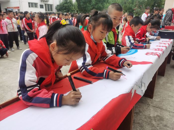 一幅十米长卷铺开,同学们一字排开,专心致志地绘图、填色。在同学们的共同努力下,和平鸽、五角星、红领巾跃然纸上,抒写对祖国母亲的美好祝愿。 伴随着“喜迎二十大,践行强国志”主题宣讲,在这个喜庆的日子里,进行了新生入队仪式。随后同学们观看“红色影片”,并开展廉洁小故事竞赛活动。
