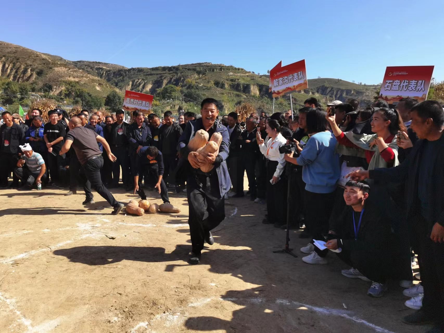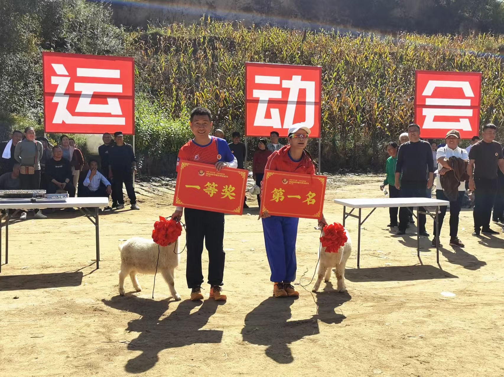 较之往年,今年丰收节活动现场同步开展全县农民运动会成为一大亮点。来自各镇15支代表队通过担红薯、夹黑豆、抢南瓜、接力送红旗等趣味十足的比赛项目,评出不同等级奖项,并颁发山羊、大鹅、土鸡、大鱼等奖品,现场加油声和欢笑声此起彼伏,气氛十分热烈。