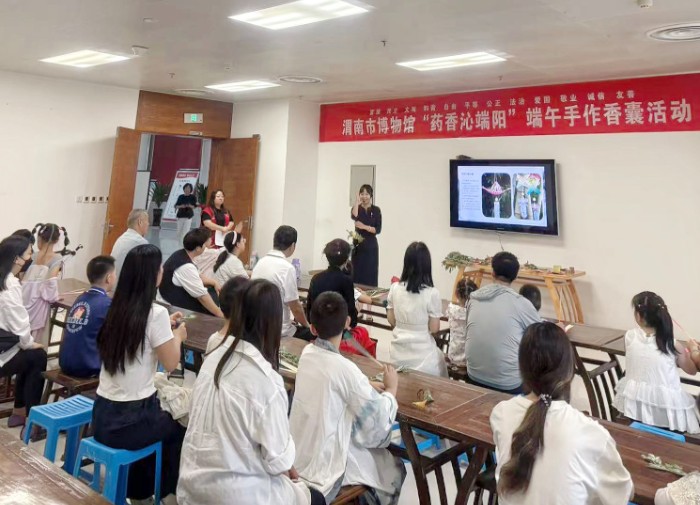 博物馆里过端午:手作体验传承千年习俗 渭南市博物馆内,“我们的节日”端午节系列活动吸引数百市民参与。“古礼祈安康”环节中,讲解员为小朋友介绍沐兰汤、点雄黄的历史渊源,并用兰汤为孩子们净手,在额头画“王”字祈福;“药香沁端阳”手作香囊活动提供竹条、艾草等材料,市民亲手制作香包与竹编小船;“铜镜铭古韵”现场,家长与孩子参照馆藏铜镜设计手作镜子,拼贴花草、捏塑动物;“清风赠雅扇”活动中,参与者体验漆染工艺,制作端午团扇,在动手实践中感受传统习俗的美好寓意。