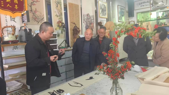 活动现场处处透着古韵:案头菊黄萸红相映,清茶回甘、果品清甜,婉转古琴声萦绕耳畔。老年书画爱好者与美协艺术家围坐案前,一方宣纸铺展,墨色晕染间,或勾勒山水或点染花鸟,重阳的意蕴与对生活的热爱尽数融于笔端。