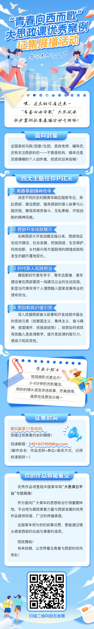 为深入贯彻落实立德树人根本任务,生动展现新时代青年投身国家战略的担当作为,大力弘扬历年来广大青年扎根西部、奉献青春的崇高精神,全景记录西部大开发战略持续推进的壮阔历程与显著成就,即日起,中国青年网正式启动 “青春向西而歌”大思政课优秀案例征集展播活动。 本次活动面向全国高校、马克思主义学院(思政部)、团委、宣传部、学生社团,各级各类思政课教师、辅导员,以及关注西部发展的社会机构、媒体和个人创作者公开征集作品,旨在挖掘、提炼和推广一批具有时代价值和教育意义的思政课教学资源。征集作品聚焦以下四个方向: 青春奉献精神传承:讲述不同历史时期青年响应国家号召,奔赴西部、建设西部、服务西部的感人故事与心路历程,展现其艰苦奋斗、无私奉献、开拓创新的精神风貌。 西部开发成就展示:反映西部大开发战略实施以来,西部地区在经济建设、社会发展、民族团结、生态保护、科技创新、乡村振兴等方面取得的辉煌成就和发生的翻天覆地变化。 时代新人实践担当:展现新时代青年学子、青年志愿者、青年建设者在西部基层一线建功立业的生动实践,彰显当代青年将个人理想融入国家发展伟业的使命担当。 思政教育价值引领:深入挖掘西部奋斗故事和开发成就中蕴含的思政元素(如爱国主义、集体主义、奋斗精神、家国情怀、民族团结等),探索如何将其有效融入思政课教学,提升思政课的吸引力、感染力和实效性。 活动要求作品以短视频为主要呈现形式,鼓励运用丰富多样的视听语言和叙事手法进行创作,力求主题鲜明、内容真实、情感真挚、制作精良、感染力强,作品时长建议控制在3-8分钟以内。 即日起至11月30日,活动参与者可将视频作品和报名资料投递至邮箱2461637656@qq.com(邮件命名:作品名称+单位+联系方式)。征集到的优秀案例作品,经筛选后,将在中国青年网重点打造的“大思政课云平台”进行专题展播。该平台作为面向广大青年进行思想政治引领的重要阵地,将为这些展现青春力量与西部发展的优秀作品提供权威、广泛的传播渠道。 期待全国各界踊跃投稿,共同讲述感人至深的西部故事,展现昂扬向上的青春风采,为“大思政课”建设注入澎湃的时代活力!