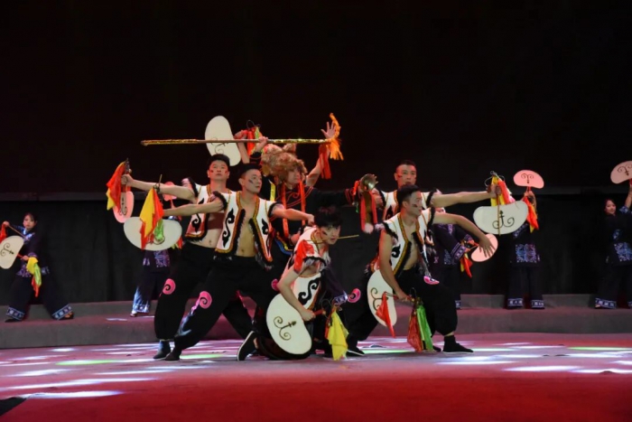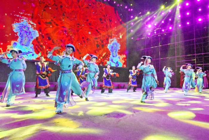 随着旋律转换,第二篇章“羌情新生”聚焦羌族生活的温情底色。舞台上,身着色彩纷呈传统服饰的男女老少,以生活化的演绎展现了羌族人民劳作耕耘、繁衍生息、喜迎新生的日常场景。满溢的生活气息让非遗文化走出陈列馆,融入烟火人间,既展现了羌族团结向上的精神风貌,更让传统文化成为滋养文明新风的鲜活载体。 第三篇章“羌魂岁月”将焦点对准国家级非物质文化遗产——羌绣。身着缀满精美羌绣服饰的姑娘们翩跹起舞,化身“指尖飞花”的绣娘,在灵动舞姿中“再现”一针一线绣制嫁衣的场景。细腻的针法、绚丽的纹样,不仅承载着羌族女子的勤劳善良,更寄托着对美好爱情的向往,让文化传承与个人情感完美交融,极具艺术感染力。