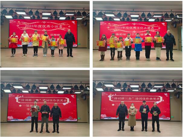为鼓励更多读者多读书读好书,营造良好的读书氛围,弘扬文化志愿者奉献精神,图书馆对2023年度“优秀小读者”及“优秀文化志愿者”进行表彰。同时为陕西省“诗词游三秦”诗词佳作征集活动获奖者颁发荣誉证书及奖品,此次活动旬阳市图书馆报送的作品中有4人获得一等奖、3人获得二等奖。