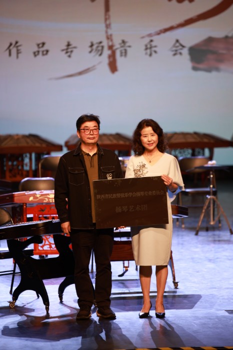 音乐会开始之前,陕西省民族管弦乐学会扬琴专业委员会会长赵新芝教授登台致辞,并宣布陕西省扬琴艺术团正式成立。随后,张效敏为艺术团授牌。