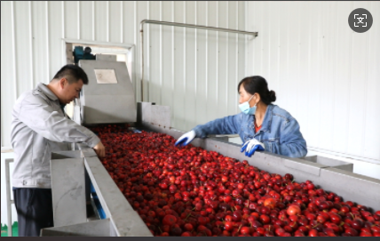 一大早,府谷县哈镇糜茬墕村阴尔崖组村民王喜林拉着自家的海红果来到聚金邦农产品开发公司。经过品质查验、称重后,一颗颗红彤彤的海红果进入生产车间,成为销往周边乃至全国各地的畅销产品。