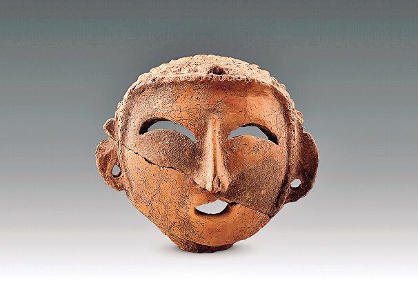 在此次公布的出土文物中,一件陶塑人面像因形象生动,备受关注。这件陶塑人面像宽约14厘米,高12.5厘米,厚 0.8耀1厘米,加工精致、头顶饱满,头顶用密集的戳刺纹表示头发,额顶正中有穿孔,两鬓连至下颌。值得一提的是,该陶塑人面像两眼呈镂空月牙形,口部镂空呈微笑状,鼻梁挺直略呈鹰钩状,双耳扁平贴于脸颊两侧,耳垂下方有穿孔耳洞。据辛宇介绍,这件陶塑人面像的颈部中空呈半弧形,整个背面有残缺。推测可能是在一个完整的器物上附着雕塑的。