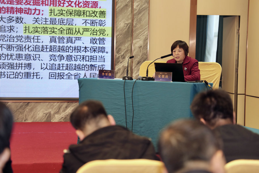 培训邀请渭南市委宣讲团成员、市委党校副校长宋筱改作专题授课。她以政策解读为基、实践需求为要,不仅从战略高度深刻阐释了文化强市建设的核心要义、时代价值与目标任务,系统解读《文化强市建设实施意见》的深层逻辑与实践路径,更紧密结合文联系统在组织创作、培育人才、服务群众等方面的工作实际,针对性提出具体思路建议,为参会人员明晰工作方向、提供实操指引。