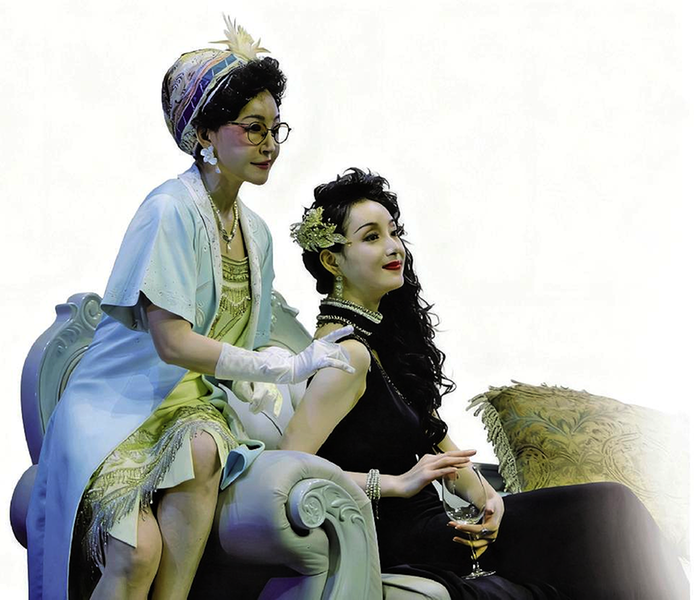 舞台上仅保留吧台、贵妃椅、茶几和电话桌等必要道具,为观众预留出充分的想象空间。同时,运用灯光、投影、实时影像等大量多媒体技术,凭借一面由 80 多盏灯搭建的光墙、流动的多媒体投影以及灵活变换的表演区域,营造出一个既抽象又极具象征意义的戏剧空间。