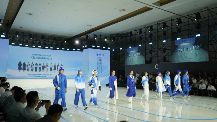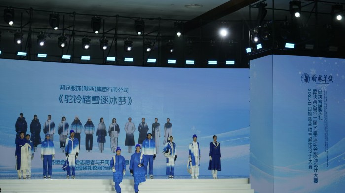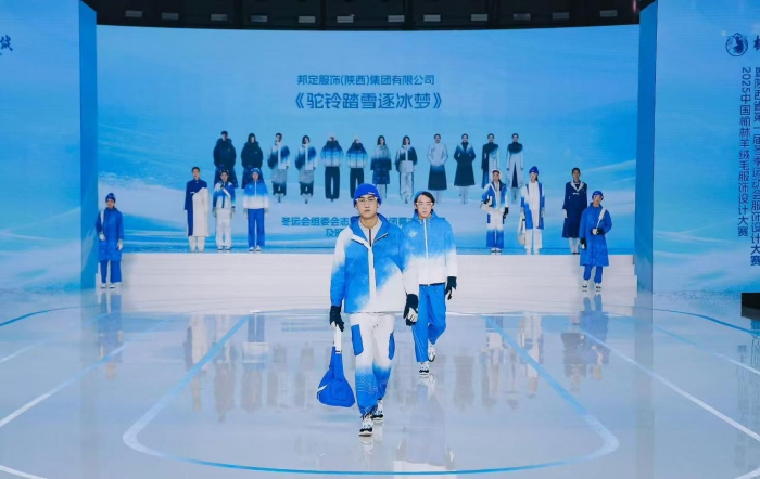 其中,由邦定服饰(陕西)集团有限公司设计制作的作品《驼铃踏雪逐冰梦》凭借突出的环保理念与科技应用,成功斩获“最具环保科技奖”。该作品采用蓝白色调,灵感源于千年丝路——昔日骆驼载着文明交汇,如今化作冰雪使者步入赛场。这抹蓝白既凝萃秦岭雪冠的纯粹、黄河浪涛的壮阔,呼应冬奥晶莹底色,更让丝路精神在竞技舞台新生,诉说人类携手同行的追求。