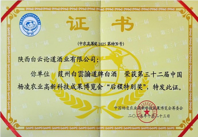 文化艺术网-文化艺术报讯(全媒体记者 李娟娟 通讯员 康亮亮)近日,第32届杨凌农高会后稷奖成果发布会在杨凌示范区举行。经过激烈角逐,160项优秀农业科技项目从全国462个参评项目中脱颖而出,分别荣获“后稷奖”“后稷特别奖”。其中陕西白云论道酒业的葭州白云论道牌白酒斩获“后稷特别奖”。