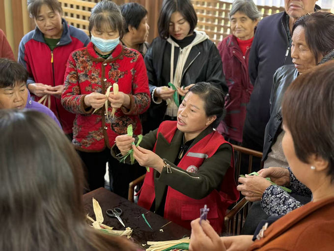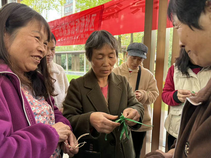 活动首站来到林机社区,渭南市民间文艺家协会陈春苗老师带来了精彩的草编展示与教学。活动现场,陈春苗老师手持普通的玉米皮,通过捻、折、编、绕等娴熟技法,短短几分钟便将其变成了形态灵动的小鱼。在老师的耐心指导下,居民们纷纷拿起材料动手尝试,从梳理玉米皮到掌握编织节奏,现场不时响起交流探讨的声音,大家专注的神情与手中逐渐成型的草编作品,让传统草编艺术的魅力在互动中充分展现。