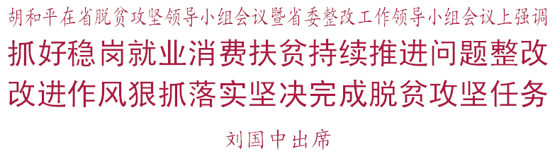 会议认真学习习近平总书记关于扶贫工作的重要论述,传达学习部分省脱贫攻坚与实施乡村振兴战略有机衔接工作座谈会精神,听取中央脱贫攻坚专项巡视“回头看”和成效考核整改进展、全省消费扶贫、稳岗就业扶贫工作情况等汇报,研究推荐参评全国脱贫攻坚奖及我省脱贫攻坚奖评选表彰有关工作,审议全省扶贫日活动方案。