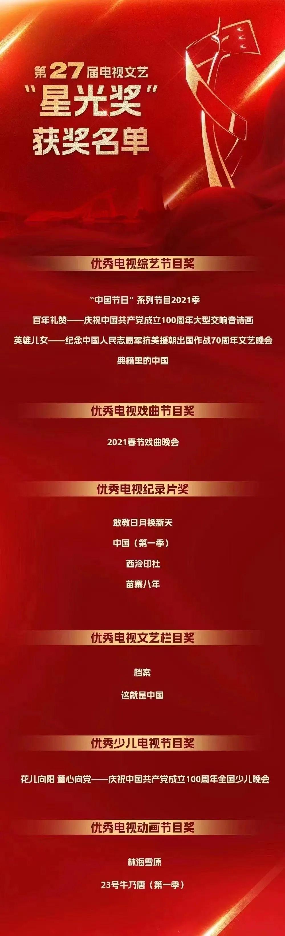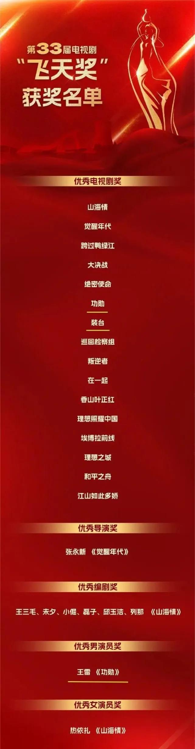 据悉,第33届电视剧飞天奖共评出优秀电视剧奖获奖作品16部,优秀导演奖、优秀编剧奖、优秀男演员奖、优秀女演员奖4个单项奖。第27届电视文艺星光奖共评出优秀电视节目奖获奖作品14部。获奖作品基本涵盖了评奖年度内最优秀的国产电视剧和电视文艺作品。这些作品具有鲜明的时代特征、紧扣主题主线,主旋律响亮,正能量充沛。充分展现出电视艺术百花齐放、生机勃勃的繁荣景象。
