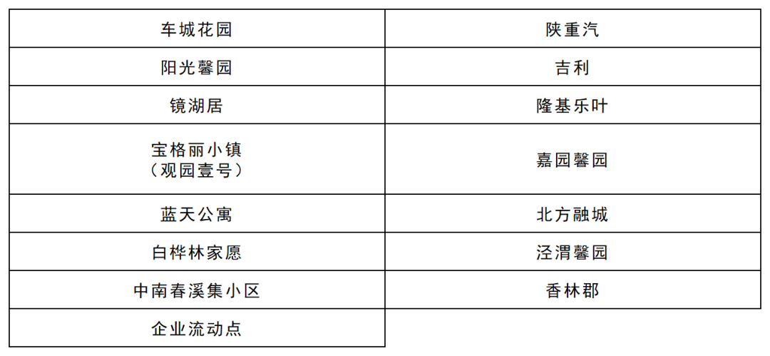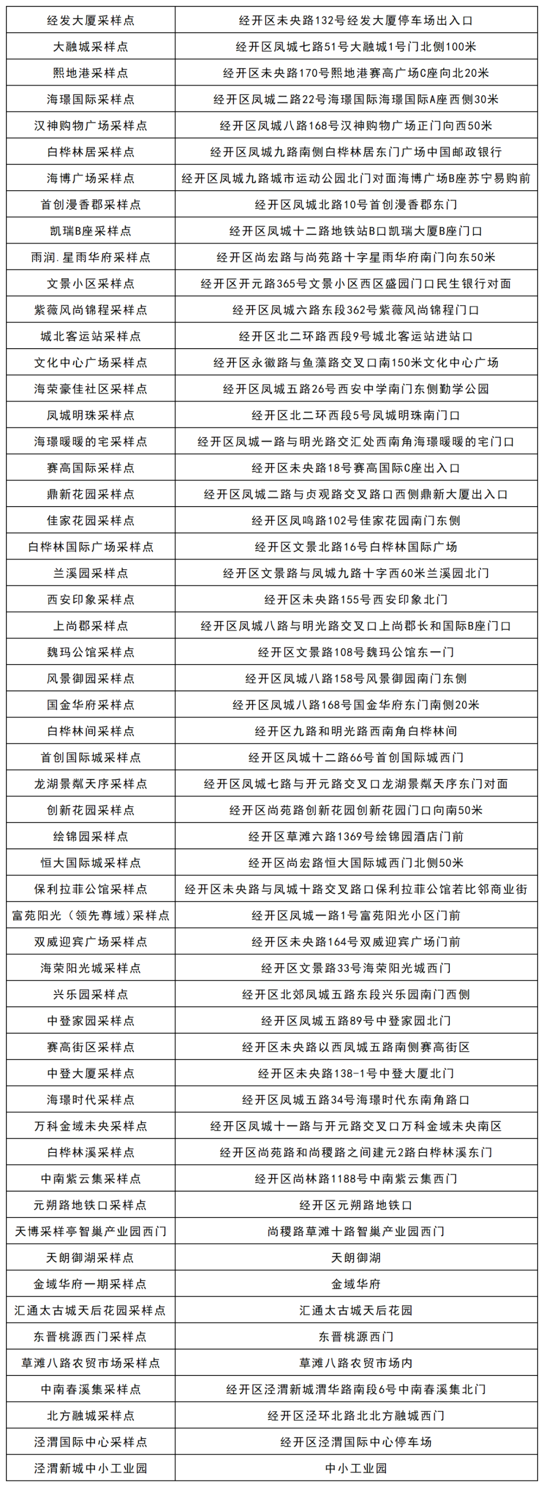 根据疫情防控需要,为了准确、全面排查疫情风险,保障大家的健康安全和日常通行,经开区将于4月11日开展规模核酸筛查工作。现将核酸筛查有关事宜通告如下: 一、采样时间 4月11日6时至12时。 二、检测范围 本次核酸筛查范围为经开区全域,包含中心城区、高铁新城、泾渭新城等。 三、注意事项 1.接受采样时,请出示“一码通”或身份证等有效证明。排队过程中请全程佩戴口罩,不交谈、不聚集。 2. 48小时内接种新冠疫苗人员不得采样。有发热、咳嗽等症状的,应及时到定点医院发热门诊就诊,不能前往核酸采样点。 3.采样完成后,将现场发放统一标识贴纸,该标识贴纸将是您出入小区、单位等公共场所的有效凭证,对于无标识贴纸者,将限制乘坐公共交通,出入小区、公司(单位)及商超等公共区域。 4. 如果您是境外及省外来返经开区人员、市内外中高风险地区来返经开区人员,或与西安市目前确诊病例在同时空有共同活动史或部分轨迹重合,请您务必要在做好自我防护的同时,第一时间向居住地所在社区、小区或单位报告,并积极配合做好后续相关防控工作。 朋友们,您的身体健康和生命安全是我们最大的心愿,希望你们能够保护好自己、呵护好家人,积极主动进行核酸采样。感谢您对疫情防控工作的支持与配合,您的理解和包容、自觉和团结就是我们的城市战胜疫情的最大底气! 经开区核酸检测点位如下