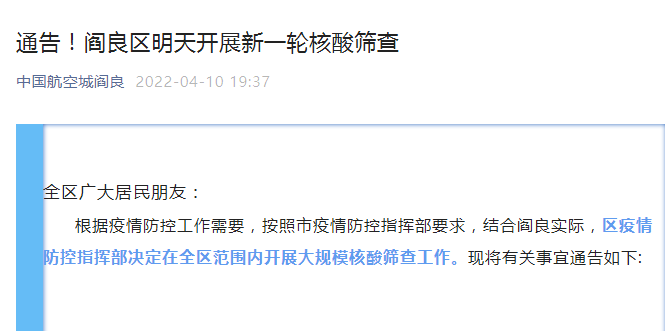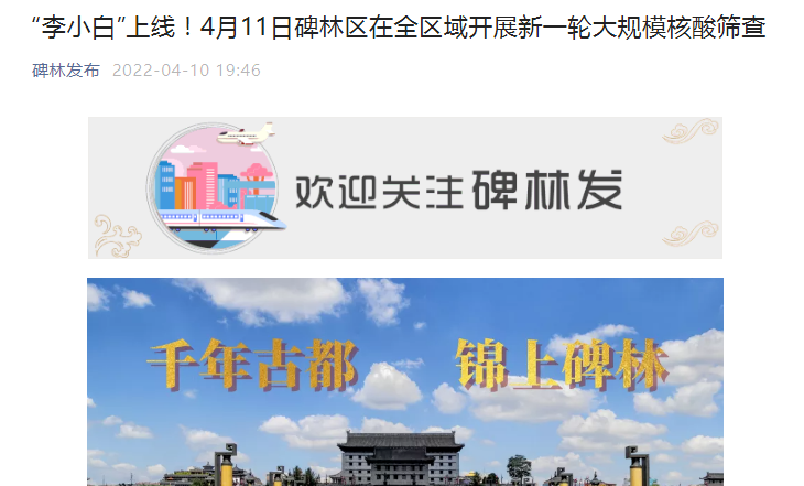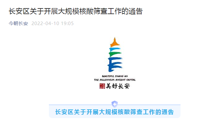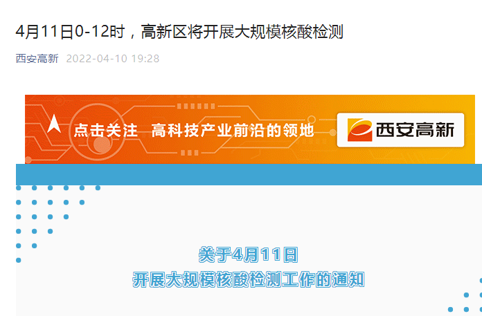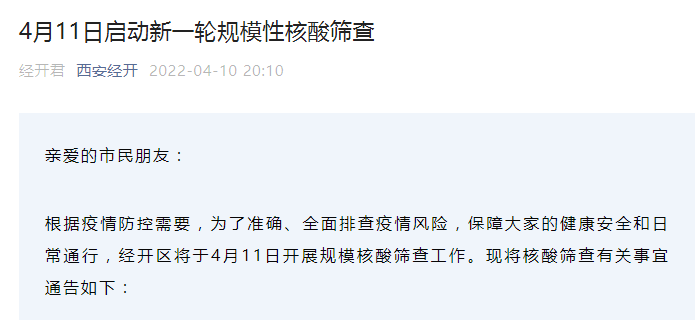 4月10日,西安市这些区域发布通告,按照全市统一安排,将于4月11日(星期一)开展大规模核酸筛查。具体通告如下: