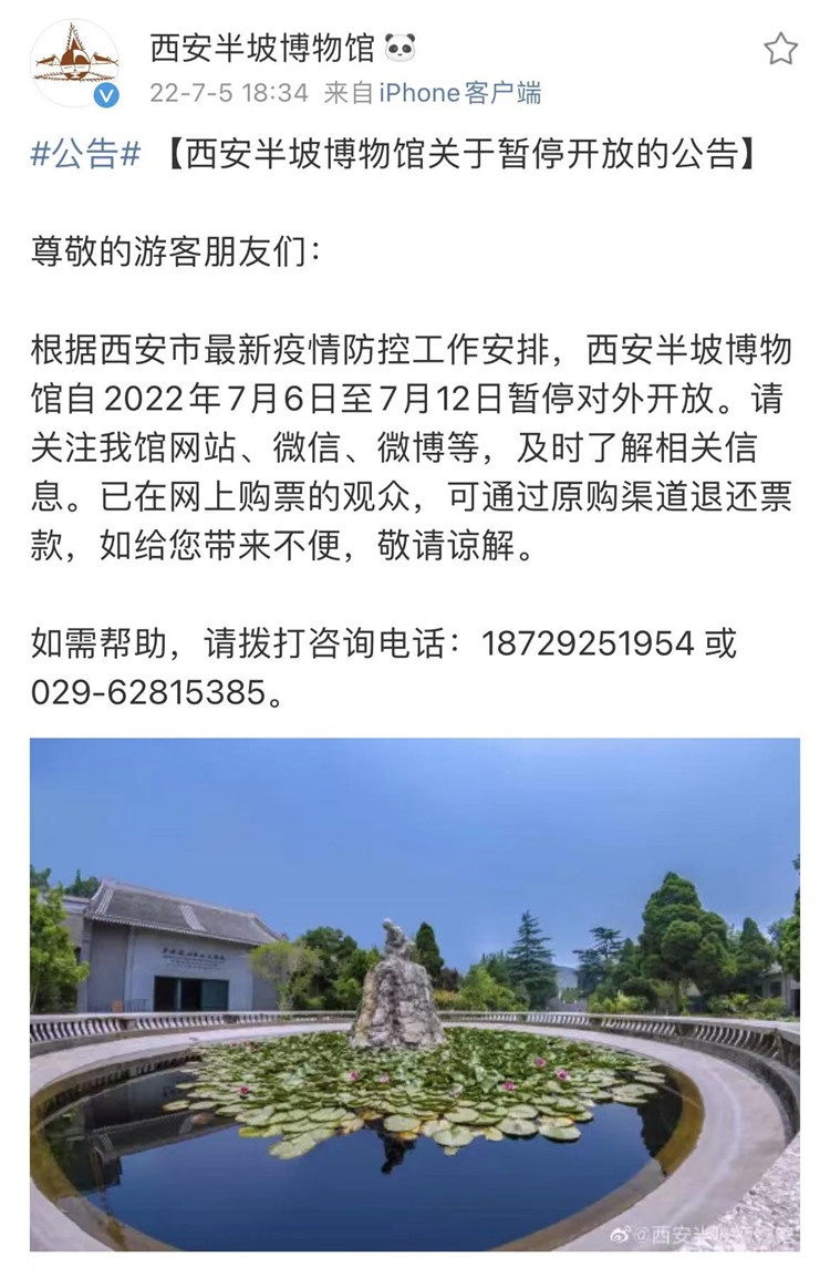尊敬的游客朋友们: 根据西安市最新疫情防控工作安排,西安半坡博物馆自2022年7月6日至7月12日暂停对外开放。请关注我馆网站、微信、微博等,及时了解相关信息。已在网上购票的观众,可通过原购渠道退还票款,如给您带来不便,敬请谅解。 如需帮助,请拨打咨询电话:18729251954 或029-62815385。 陕西省美术博物馆暂停开放公告 各位观众朋友们: 根据西安市最新疫情防控工作安排,我馆于7月6日(周三)起暂停开放,恢复开放时间另行通知。 给您带来的不便,敬请谅解。 陕西省美术博物馆 2022年7月5日 陕西考古博物馆暂停开放公告 尊敬的观众朋友们: 根据西安市最新疫情防控工作安排,陕西考古博物馆于2022年7月6日(星期三)起暂停开放,恢复开放时间另行通知。请关注陕西考古博物馆官方微信、微博,及时了解相关信息。给您带来不便,敬请谅解! 已经网上预约的观众,待我馆恢复开馆后,凭预约码换票参观。 疫情防控,人人有责,感谢您的理解和配合。 陕西省考古研究院(陕西考古博物馆) 2022年7月5日 西安市钟鼓楼博物馆明日起暂停开放 尊敬的游客: 根据西安市最新疫情防控工作安排,西安市钟鼓楼博物馆将于2022年7月6日至7月12日暂停开放,已经在网上购票的游客,可以通过原购票渠道自行申请退款,由此给您带来不便敬请谅解, 如需咨询或帮助请拨打服务电话029-87276420(钟楼),029-87278797(鼓楼)。 疫情防控,人人有责,感谢您的理解与配合。 特此公告 西安市钟楼博物馆 2022年7月5日 来源:群众新闻 编辑:晓佳相关推荐: