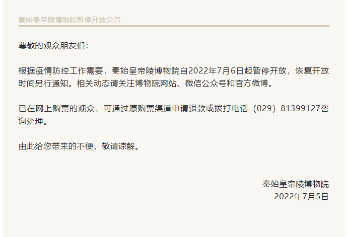 根据疫情防控工作的需要,西安市多个公共场所暂停开放。 秦始皇帝陵博物院暂停开放公告 尊敬的观众朋友们: 根据疫情防控工作需要,秦始皇帝陵博物院自2022年7月6日起暂停开放,恢复开放时间另行通知。相关动态请关注博物院网站、微信公众号和官方微博。 已在网上购票的观众,可通过原购票渠道申请退款或拨打电话(029)81399127咨询处理。 由此给您带来的不便,敬请谅解。 秦始皇帝陵博物院 2022年7月5日