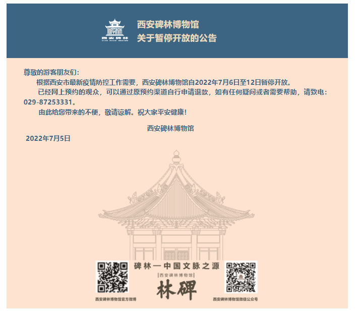 西安碑林博物馆 的游客朋友们: 根据西安市最新疫情防控工作需要,西安碑林博物馆自2022年7月6日至12日暂停开放。 已经网上预约的观众,可以通过原预约渠道自行申请退款,如有任何疑问或者需要帮助,请致电:029-87253331。 由此给您带来的不便,敬请谅解。祝大家平安健康! 西安碑林博物馆 2022年7月5日