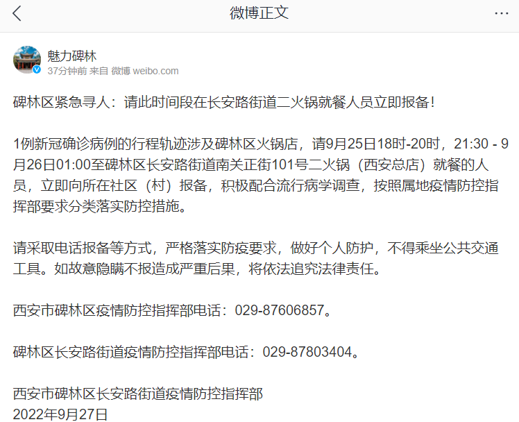 官方微博截图 碑林区紧急寻人:请此时间段在长安路街道二火锅就餐人员立即报备! 1例新冠病毒阳性感染者的行程轨迹涉及碑林区火锅店,请9月25日18时-20时,9月25日21时30分 - 9月26日凌晨1时至碑林区长安路街道南关正街101号二火锅(西安总店)就餐的人员,立即向所在社区(村)报备,积极配合流行病学调查,按照属地疫情防控指挥部要求分类落实防控措施。 请采取电话报备等方式,严格落实防疫要求,做好个人防护,不得乘坐公共交通工具。如故意隐瞒不报造成严重后果,将依法追究法律责任。 西安市碑林区疫情防控指挥部电话:029-87606857。 碑林区长安路街道疫情防控指挥部电话:029-87803404。 西安市碑林区长安路街道疫情防控指挥部 2022年9月27日 未央区紧急寻人公告