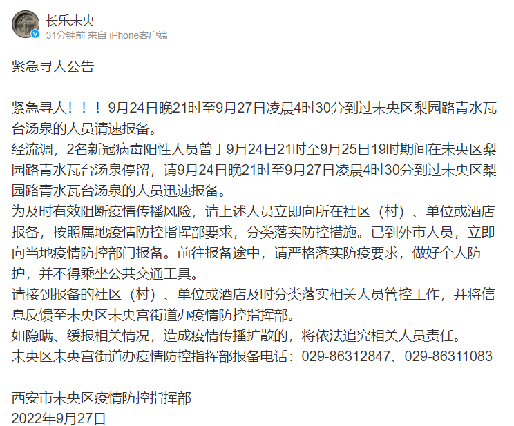 官方微博截图 9月24日21时至9月27日凌晨4时30分到过未央区梨园路青水瓦台汤泉的人员请速报备。 经流调,2名新冠病毒阳性人员曾于9月24日21时至9月25日19时期间在未央区梨园路青水瓦台汤泉停留,请9月24日21时至9月27日凌晨4时30分到过未央区梨园路青水瓦台汤泉的人员迅速报备。 为及时有效阻断疫情传播风险,请上述人员立即向所在社区(村)、单位或酒店报备,按照属地疫情防控指挥部要求,分类落实防控措施。已到外市人员,立即向当地疫情防控部门报备。前往报备途中,请严格落实防疫要求,做好个人防护,不乘坐公共交通工具。 请接到报备的社区(村)、单位或酒店及时分类落实相关人员管控工作,并将信息反馈至未央区未央宫街道办疫情防控指挥部。 如隐瞒、缓报相关情况,造成疫情传播扩散的,将依法追究相关人员责任。 未央区未央宫街道办疫情防控指挥部报备电话:029-86312847、029-86311083 西安市未央区疫情防控指挥部 2022年9月27日 来源:群众新闻 编辑:晓佳上一篇:9月26日陕西新增2例本土确诊病例 新增1例本土无症状感染者