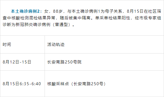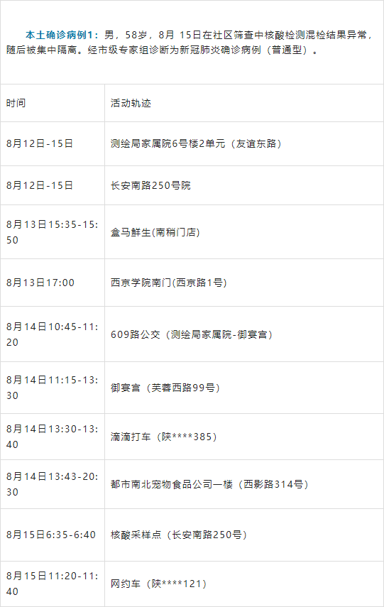 8月15日0-24时,西安市新增4例本土确诊病例,2例为8月15日发布的无症状感染者2、无症状感染者4转确诊病例,为省外输入病例(轨迹昨日已公布)。其余2例在社区筛查中发现,为母子关系,主要活动轨迹如下: