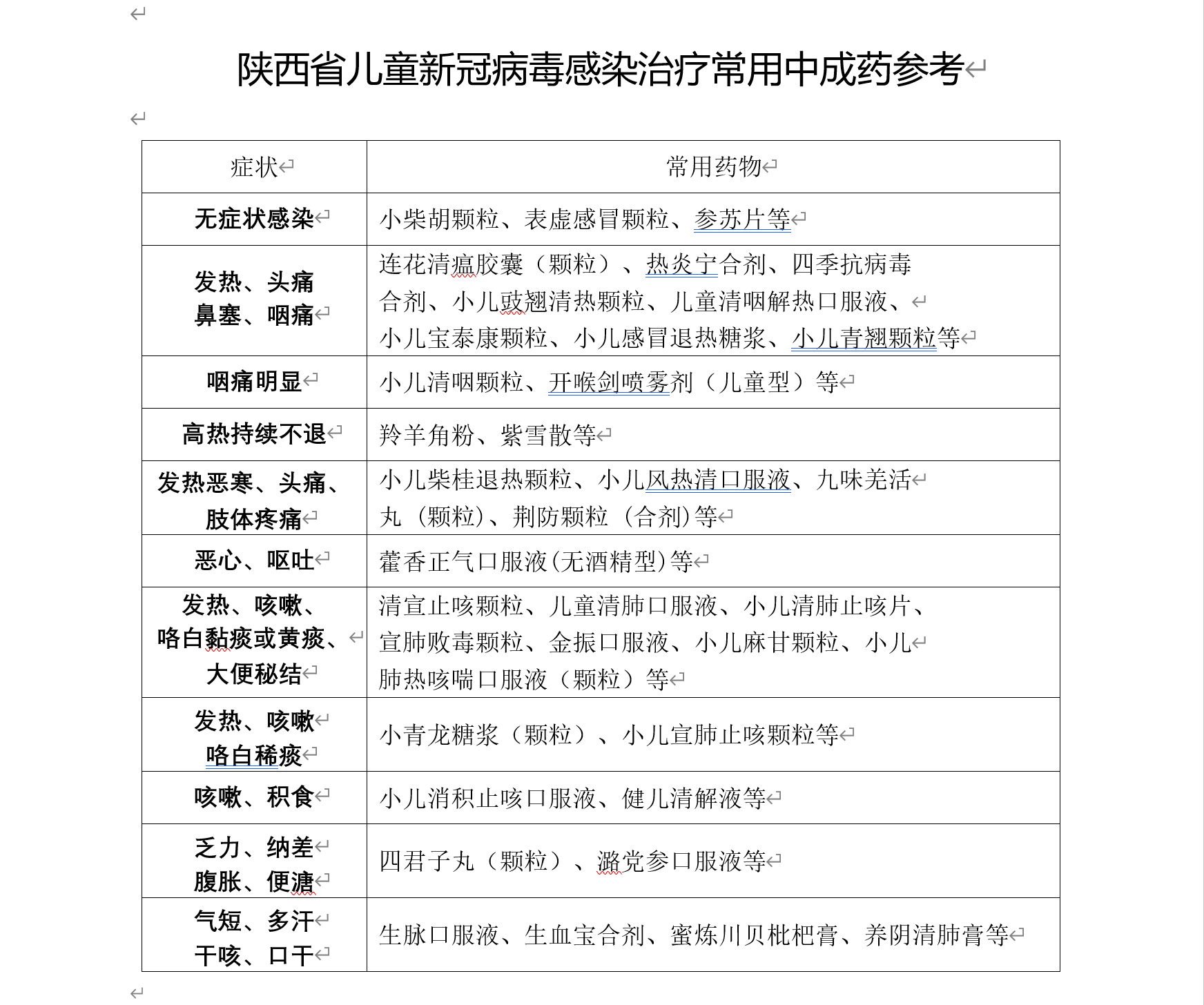 12月13日,陕西省卫生健康委、省中医药管理局联合印发陕西省新冠病毒感染中医药治疗方案第四版。第四版的治疗方案对第三版方案进行了优化,分别提出了儿童无症状感染者、轻型、普通型及恢复期感染者的中医辨证论治方案,提供了临床相关症状的常用中成药参考目录,方便广大临床一线医生及感染者参考使用。具体内容如下: 陕西省儿童新冠病毒感染中医药 治疗方案(试行第四版) 本病属于中医“疫病”范畴,病因为疫毒之邪,由口鼻而入,病位在肺卫,也可累及脾、胃等多个脏器。小儿脏腑娇嫩,易虚易实,易寒易热,易于受到疫毒侵袭,出现肺卫受损,甚则心肝受累。疾病过程中有虚、寒、湿、热、毒等病机变化。中医药治疗原则为早防、早诊、早治。相关中成药的使用参见附表。 一、 药物口服 (一)无症状感染者治法:益气解毒。处方:异功散加减。 方药:太子参6g、白术6g、茯苓5g、生甘草3g、金银花6g、板蓝根6g、桔梗5g、黄芩5g、陈皮6g、炒麦芽5g。 煎服法:药物用凉水浸泡 30 分钟,大火熬开后改为小火 15 分钟,煎煮两次,共取汁 50-100ml,连服 3-5 天。 用法:3月以上服用,3岁以下每日0.5剂,3-6岁每日1剂, 6-9岁每日1.5剂,9岁以上每日2剂,均分3次口服。 (二)轻型 1.风热证 主症:发热,有汗或无汗,头痛鼻塞,咽痛,或偶有咳嗽,咽红肿痛。 舌脉:舌质红,苔薄黄,脉浮数。治法:疏风解表,清热解毒。 处方:银翘散加减。 方药:金银花6g、桑叶6g、连翘4g、桔梗6g、牛蒡子6g、芦根8g、玄参6g、白芍5g、鸡内金5g、荆芥5g、钩藤6g、甘草3g、生石膏8g(先煎)、知母5g。 加减:发热加柴胡 6-10g,鼻塞加辛夷 4-6g,恶心呕吐加陈皮 4-6g、竹茹 4-6g;便干结加炒枳实 5-10g。 煎服法:药物用凉水浸泡30分钟,大火熬开后改为小火15分钟,煎煮两次,共取汁50-100ml,连服3-5天。 用法:3月以上服用,3岁以下每日0.5剂,3-6岁每日1剂, 6-9岁每日1.5剂,9岁以上每日2剂,均分3次口服。 2.风寒夹湿,兼有里热证 主症:恶寒发热,无汗,头痛项强,肢体酸楚疼痛,口苦微渴,可伴有恶心呕吐。 舌脉:舌苔白或微黄,脉浮。 治法:发汗解表,散寒除湿,兼清里热。处方:九味羌活汤加减。 方药:羌活 6g、防风 6g、苍术 6g、细辛 1.5g、川芎 6g、 白芷 6g、生地 6g、黄芩 6g、金银花 6g、枳实 5g、厚朴 4g、柴胡 6g、葛根 5g、甘草 3g。 煎服法:药物用凉水浸泡 30 分钟,大火熬开后改为小火 15 分钟,煎煮两次,共取汁 50-100ml,连服 3-5 天。 用法:3月以上服用,3岁以下每日0.5剂,3-6岁每日1剂,6-9岁每日1.5剂,9岁以上每日2剂,均分3次口服。 (三)普通型 1.痰热蕴肺证 主症:发热,咳嗽痰多,色黄,憋闷气促,大便秘结,咽红。舌脉:舌质红,苔黄腻或黄燥,脉滑数或弦滑。 治法:宣肺清热,化痰止咳。处方:麻杏石甘汤加减。 方药:生麻黄3g、苦杏仁3g、生石膏10g(先煎)、清半夏6g、黄芩9g、陈皮6g、桑白皮9g、蜜紫苑6g、浙贝母5g、芦根10g、全瓜蒌6g、枳实6g、鸡内金6g、生甘草3g。 煎服法:药物用凉水浸泡 30 分钟,大火熬开后改为小火 15 分钟,煎煮两次,共取汁 50-100ml,连服 3-5 天。 用法:3月以上服用,3岁以下每日0.5剂,3-6岁每日1剂, 6-9岁每日1.5剂,9岁以上每日2剂,均分3次口服。 2.寒湿阻肺证 主症:发热,或未热,咳嗽,咯白色泡沫痰,鼻塞,清涕,倦息乏力,或呕恶。 舌脉:舌质淡或淡红,苔白或白腻,脉濡。治法:解表蠲饮,宣肺止咳。 处方:小青龙汤加减。 方药:生麻黄3g、桂枝4g、炙甘草3g、干姜4g、细辛1.5g、五味子5g、法半夏4g、白芍6g、苍术5g、陈皮5g、瓜蒌6g、浙贝母5g、款冬花5g、蜜紫苑5g。 煎服法:药物用凉水浸泡 30 分钟,大火熬开后改为小火 15分钟,煎煮两次,共取汁 50-100ml,连服 3-5 天。 用法:3月以上服用,3岁以下每日0.5剂,3-6岁每日1剂, 6-9岁每日1.5剂,9岁以上每日2剂,均分3次口服。 (四)重型、危重型 重型、危重型,参照国家最新版新型冠状病毒感染诊疗方案进行中西医结合救治。 (五)恢复期1.肺脾气虚证 主症:气短,倦息乏力,纳差呕恶,痞满,大便无力,便溏不爽。 舌脉:舌淡胖,苔白腻,脉细无力。治法:益气健脾。 处方:香砂六君子汤化裁。 方药:太子参5g、炒白术3g、茯苓5g、炙甘草3g、法半夏3g、陈皮5g、木香3g(后下)、砂仁3g(后下)、黄芪5g、佩兰3g、鸡内金5g。 煎服法:药物用凉水浸泡30分钟,大火熬开后改为小火15分钟,煎煮两次,共取汁50-100ml,5-7天。 用法:3月以上服用,3岁以下每日0.5剂,3-6岁每日1剂, 6-9岁每日1.5剂,9岁以上每日2剂,均分3次口服。 2.气阴两虚证 主症:乏力,气短,口干,口渴,心悸,汗多,纳差,低热或不热,干咳少痰。 舌脉:舌干少津,脉细或虚无力。 治法:益气养阴,清热生津。 处方:沙参麦冬汤合生脉散化裁。 方药:北沙参5g、麦冬6g、西洋参5g、五味子5g、生石膏6g(先煎)、淡竹叶5g、桑叶5g、芦根6g、丹参6g、玄参5g、川贝1g、生甘草 3g。 煎服法:药物用凉水浸泡 30 分钟,大火熬开后改为小火 15 分钟,煎煮两次,共取汁 50-100ml,连服 5-7 天。 用法:3月以上服用,3岁以下每日0.5剂,3-6岁每日1剂, 6-9岁每日1.5剂,9岁以上每日2剂,均分3次口服。 二、 外治疗法 (一)推拿疗法 1.症见咳嗽 予清肺经、揉肺俞、揉膻中、点揉列缺。2.症见发热 予开天门、推坎宫、运太阳、揉风池、清天河水、清肺经。 3.症见头痛、鼻塞、流涕 予开天门、推坎宫、点揉迎香、揉太阳、点揉风池、掐揉耳后高骨。 4.症见肌肉酸痛、恶风 予揉肺俞、清肺经、推膀胱经、点揉风池。 注意:相关操作需经中医