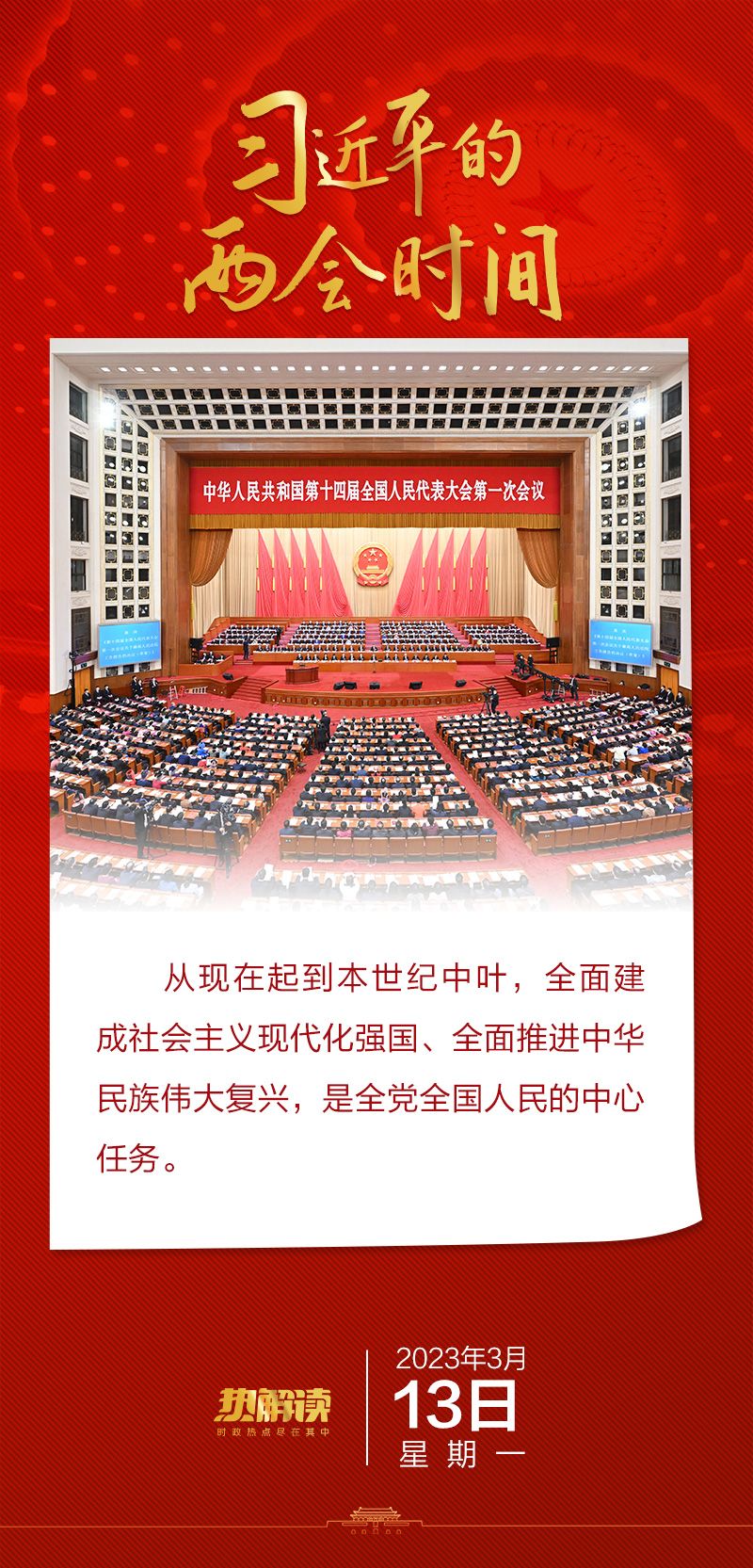 “强国建设、民族复兴的接力棒,历史地落在我们这一代人身上。” 3月13日,第十四届全国人民代表大会第一次会议闭幕,习近平主席发表重要讲话,其中首次提到全党全国人民的中心任务。 去年10月16日,习近平总书记在党的二十大报告中庄严宣示中国共产党的中心任务。两个中心任务一脉相承,同向同行。