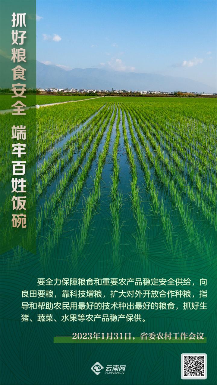 2月13日,2023年中央一号文件公布,这是21世纪以来第20个指导“三农”工作的中央一号文件。 守好“三农”基本盘至关重要、不容有失。 今年1月31日,省委农村工作会议召开,对守牢确保粮食安全、防止规模性返贫等底线,扎实推进乡村发展、乡村建设、乡村治理等重点工作,加快建设特色农业强省,建设宜居宜业和美乡村等工作进行安排部署,打造特色农业强省的冲锋号再次吹响,云岭各地“三农”人携手并进,在澎湃春潮中奏响拼搏奋斗的“三农”奋进曲。 2022年 云南“三农”稳中有进 全省粮食再获丰收 新春伊始 围绕“3815”战略发展目标 聚焦建设特色农业强省目标 全省上下一盘棋 踏着春风迈上新征程 抓好粮食安全 端牢百姓饭碗