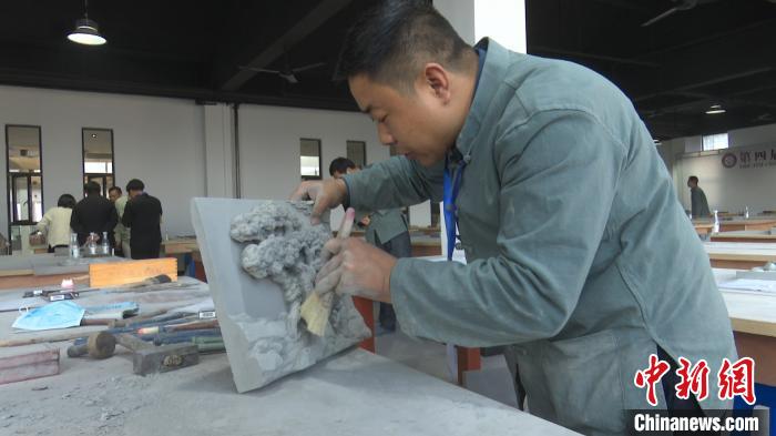 临夏回族自治州代表团尹宽的作品——“歌舞盛世”。 刘鸿鹤 摄 “砖雕艺人通过现场雕刻、专家评审、互动研讨等活动环节,既展示了全国各地极具地域特色的砖雕作品,又让各大流派互相学习,互相借鉴,进而提高我们的砖雕技艺,同时从材料改善、制作改良、设计创意、应用创新等方面,探讨如何提升砖雕传统手工技艺。”安徽歙县文化和旅游体育局副局长黄德耀介绍说。