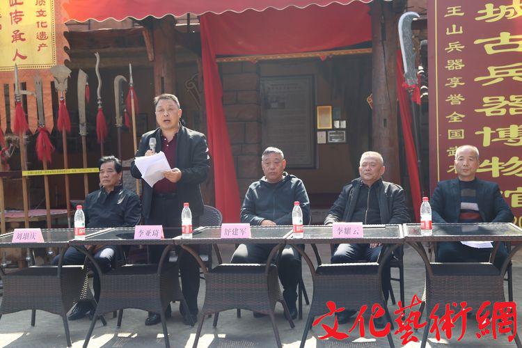 西安市级非遗项目周至王氏手工打铁技艺传承人、古兵器展览馆负责人王海泉讲话 周至县文化和旅游体育局党委书记、局长舒建军为“古兵器展览馆”揭牌。周至县文化馆副馆长、周至县非遗保护中心副主任李亚琦致辞并主持揭牌仪式。周至县文化和旅游体育局、县文化馆、周城景区领导及媒体和社会各界人士200余人出席活动。