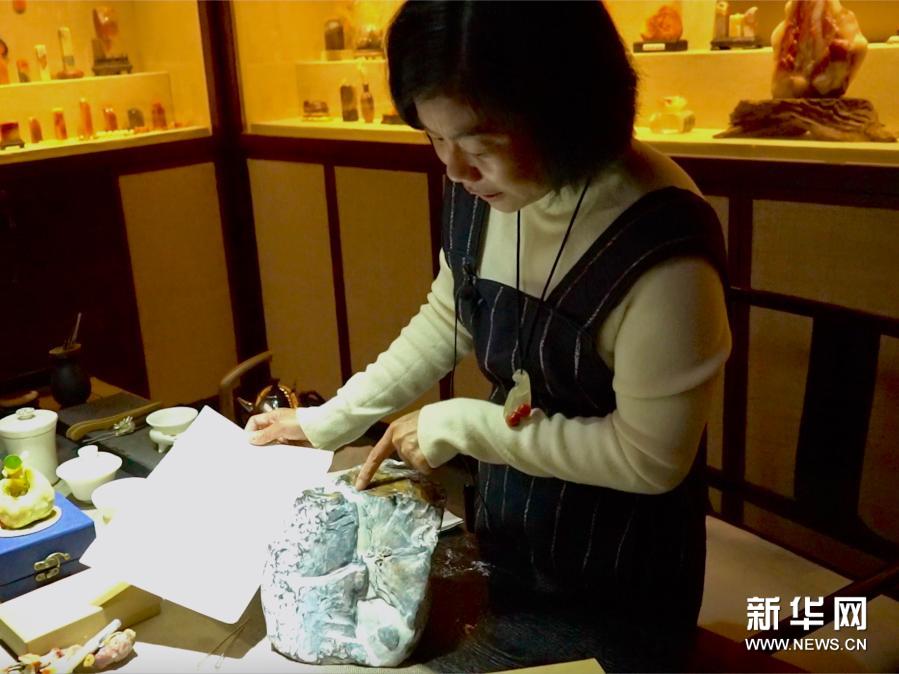 寿山石雕刻师叶子在进行寿山石雕刻(2020年12月10日摄)。新华社记者 褚萌萌 摄 新华社福州1月18日电 题:刀石下有绕指柔 匠心孕育“她”力量 新华社记者褚萌萌、陈思琪 一朵鲜艳饱满的紫色刺绣牡丹,下面坠着一只玲珑晶莹的红色石雕蝴蝶,再点缀以流苏穗子。这件精美的小饰品是寿山石雕刻师叶子从业30年后的最新创意:融合两项跨越千里的非遗技艺——宁夏刺绣和福建寿山石雕。 去年年初,叶子作为福建省妇联闽宁协作公益扶贫人去宁夏,参观了当地的刺绣等民间技艺。“同行的人都在感叹这些作品好美,而我在想怎么能将雕刻与之结合。”叶子说,“捐款捐物是一时的,我想用技艺提供一些更持久的帮助。” 寿山石雕刻师叶子在进行寿山石雕刻(2020年12月10日摄)。新华社记者 褚萌萌 摄 于是,去年下半年以来,叶子兼纳石雕和刺绣之美,设计了挂饰、发夹等一系列产品,为宁夏的手艺人增加了收入。同时,在不可再生的寿山石资源渐趋稀少之际,用曾经被雕刻师们丢弃的小块边角料制作创意产品,也为寿山石雕刻技艺寻得一条新出路。 作为为数不多的女性寿山石雕刻师之一,她认为自己的创作源于女性丰富的情感和细腻的感悟。坚刀硬石中也有绕指柔情,30年来,她的手磨出茧子、磨变了形,但她却用匠心孕育出独特的女性力量。 寿山石雕刻师叶子介绍自己对一块石料的设计构思(2020年12月10日摄)。新华社记者 褚萌萌 摄 1991年,刚从美术学院毕业不久的叶子,有一天路过福州一石雕作坊,偶然捡到了一块寿山石。在这场“一眼一生”的邂逅中,叶子感觉眼前的石头“美得发光”,便将其带回家,随心雕刻起来。 “每天结束工作后,夜深人静时,我雕着石头,感觉好像在跟石头对话,精神上很放松。”叶子回忆。 雕了一年后,叶子带着自己的一袋子作品来到福州一花鸟器物市场摆了个小摊儿,一上午销售一空,还接到几个预定订单。又过了两三年,叶子愈发觉得寿山石“越看越漂亮,越玩越有意思”,也靠着寿山石雕开起了小店,便辞去工作,专职雕刻。 产于福建福州的寿山石莹润质软,色彩斑斓,适宜雕刻器件。历史悠久的寿山石雕刻技艺有“一相抵九工”之说,讲求因循石材原本的条纹色泽进行创作。 寿山石雕刻师叶子的寿山石雕作品《满堂红》(2020年12月10日摄)。新华社记者 褚萌萌 摄 在她的作品《满堂红》中,黄白底色石材上的道道红纹,被雕成了池中的游鱼。另一件名为《空山行旅》的作品中,石材中部天然的裂缝,则在她的刀下变为山水间的空谷与漫步其中的行人。 “每块石头都有自身的气质,每次雕刻都好像遇见一位新朋友。”叶子说。入行以来,叶子别出心裁的创作屡屡在展览、比赛中吸引关注,她本人也获评福建省工艺美术大师。