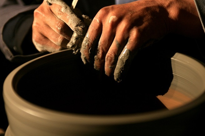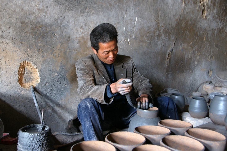 一团泥巴 在脚下踩了千遍万遍 一双巧手 让生活不再简单 黑色的煤里 串起三尺火焰 那些被赋予新生的物件 在老百姓的日子里承传 岁月不居 你坚守着一个执念 世代变换 你驻守在百姓的心田 澄城砂器烧制技艺介绍: 澄城砂器主要产于尧头镇白家城、红科两个自然村。这里矿产资源丰富,坩土矿夹生白、紫两色,分布于沟涧石崖中,同时盛产优质煤炭,为砂器烧制提供了得天独厚的条件。根据明代《澄城县志》记载,澄城“瓷砂始于唐”,清代,尧头手工烧制陶瓷、砂器已颇具规模。行销澄城、合阳、大荔、洛川以及铜川各地。 澄城砂器烧制有五大工序:一是和泥,把坩土矿石粉碎、煤烧焦粉碎,按3:1的比例加水混和成泥;二是踩泥,踩时从一边紧挨着转圈踩,直至把整块泥踩完,如此反复十五六遍;三是制坯,一个人操作,先拨动轮子,使其转动后,再在轮上拔泥制坯;四是上釉,白坩土加水制成釉料,把砂坯放到釉料里快速蘸一下,然后放到轮子上旋转匀称;五是烧坯,用火焰高达一米的旺火烧好后快速把砂器挑出,扣在铁锅盖下焐2—3分钟之后取出。澄城砂器制品用作食具有利于食品保鲜,其原料、制作过程都是天然的,符合绿色环保理念。澄城砂器烧制技艺2009年被列入第二批陕西省非物质文化遗产名录。 作者简介: 王文超,陕西省渭南市临渭区人,现为临渭区党史研究室干部,中国毛泽东诗词研究会会员,渭南市诗词学会副秘书长,渭南市临渭区作协副主席。著有《新中国从这里走来》《渭南地下交通线纪实》《张秋香小传》等。