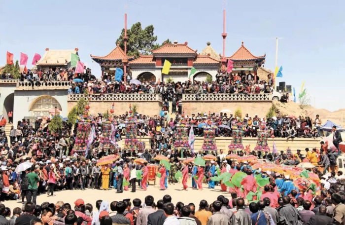 抬龙王 杨勇 摄 花送到娘娘庙,旧神主往进递,新神主往回接,摆放到庙内,接下来举行两个仪式,一个叫列鬼,由人装成鬼子,戴青面獠牙的假面具,穿黄袍,手拿圪节鞭。列鬼是一种舞蹈表演,一般由两个人或三个人对舞,做一些张牙舞爪的动作。列鬼结束后,要进行恭蘸,恭蘸由主办神事的村派人,穿长袍,用祭祀的碗肉糕点水果之类的东西向娘娘庙诸神位轮流上供,按规定要转上七十二圈才结束。秧歌队再次表演,表演完后,伞头唱秧歌,然后领着乐队、秧歌队及送娘娘的人马离庙返回村里,至此,送娘娘上山的活动结束,结束后花由会里的人向其他各庙的神位分别献上一朵,会里办事的人各发一朵,剩余的在庙里焚烧,旗帜、仪仗、楼轿等放回原处,准备下年再用。 白草寺庙会以其极具地域性的文化特征,成为清涧地区乃至陕北地区民间信仰活动类庙会的典型载体。七彩的花树、潮涌的信民,伴着吼天撼地的唢呐声,能抢到花叶子的生男孩,能抢到花苞的生女孩,已成为山乡人家的精神家园。花会这种特殊庙会形式,除去敬神功能,有很高的观赏性,再加上古装古调的大戏、红火的秧歌、吼天撼地的唢呐,形成极强的娱神娱人的特征,并且具有广泛的群众性特征。 2008年,清涧白草寺庙会被列为榆林市第一批非物质文化遗产保护项目。2018年,被列入省级非物质文化遗产项目名录。近年来,为了保护与传承白草寺庙会这一极具民间信仰和民俗活动的文化形式,当地相关部门制定了保护计划。例如全面恢复、修缮已破旧的庙宇、亭台、碑记,极力抢救老祖先遗留的传统文化;定期举办庙会活动。以三月三花会为重,继承保护白草寺庙会这一民间信仰活动;成立白草寺庙会保护组织机构;组织收集整理庙会图片、文字、音像资料,建立庙会档案;成立白草寺民俗文化研究协会,深入开展调查研究工作。 文化艺术报全媒体记者 魏韬 编辑:北月上一篇:【非遗】雕出绥德人的美好生活和精神信仰——国家级非遗绥德石雕