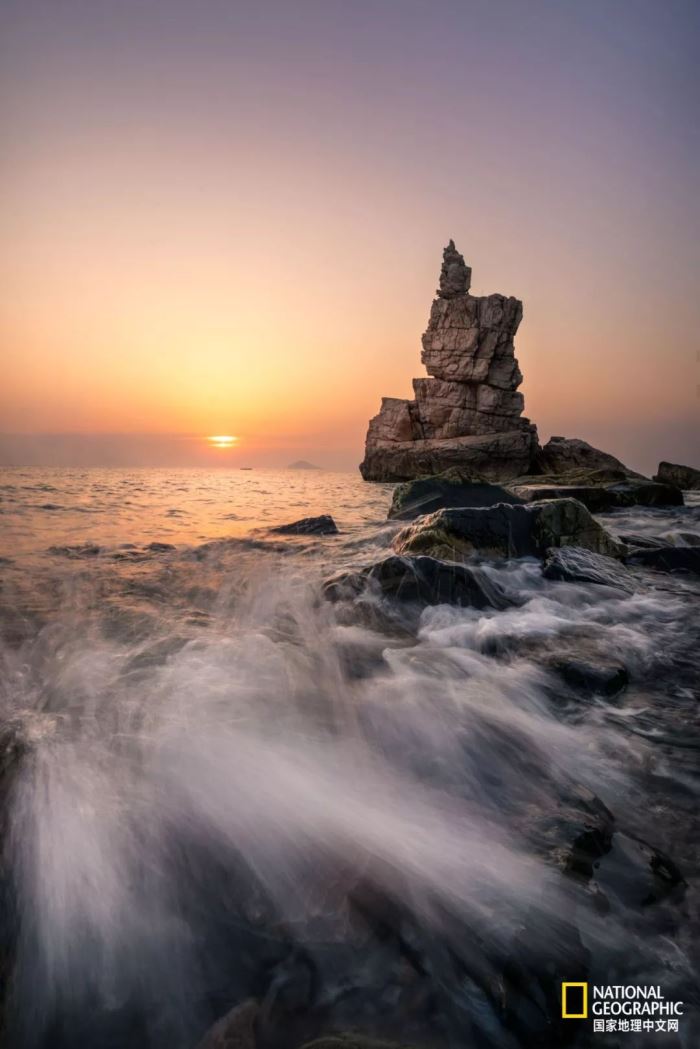 日落时分的桌子腿,只有退潮以后这定海神针才肯显现。沐浴夕阳中,石柱上反射出海水留下的痕迹闪闪发光。