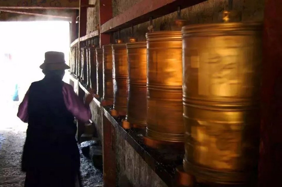 ©加都风铃(上海) 墙边的转经筒在转经人的转动下,发出吱吱的响声,他们左手持念珠,右手慢慢转动转经筒,口中念念有词。