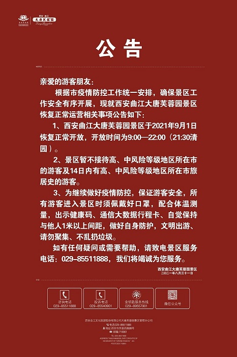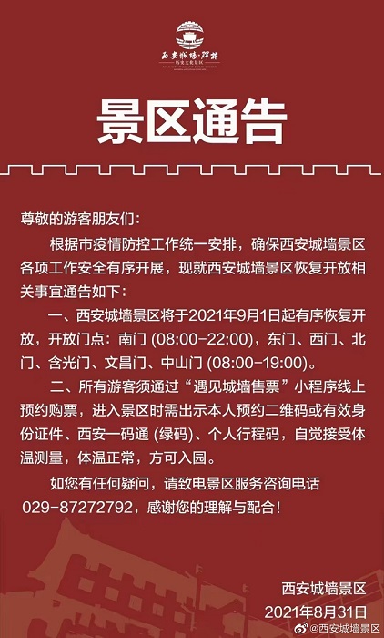 8月31日晚,西安城墙景区发布通告,根据西安市疫情防控工作统一安排,西安城墙景区将于9月1日起恢复正常开放。开放门点:南门(8:00一22:00),东门、西门、北门、含光门、文昌门、中山门(8:00一19:00)。所有游客须通过“遇见城墙售票”小程序线上预约购票,进入景区时出示本人预约二维码或有效身份证件、西安一码通(绿码)、个人行程码,自觉接受体温测量,体温正常,方可入园。 除了西安城墙景区,8月31日,西安大唐芙蓉园、曲江池遗址公园、曲江海洋极地公园、杜邑遗址公园等多家景区也相继发布公告,将于9月1日起恢复正常开放。