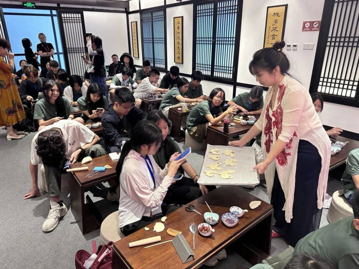 随后,一行人步入史记文化街区,这里是以“史记”为主题的特色街区,布设有各种业态项目和文化展馆。通过参观场馆,学生们深入了解了司马迁的生平事迹与精神品质,被其“究天人之际,通古今之变”的宏伟抱负所震撼,更对《史记》这部“史家之绝唱,无韵之离骚”产生了浓厚的兴趣与敬仰。紧接着,大家来到史记体验馆展开了一场别开生面的“花馍”文化体验活动。作为民间传统面塑艺术的瑰宝,“花馍”以其独特的艺术魅力、形态各异的特点深受人们喜爱。活动现场,花馍非遗老师现场演示,从和面、揉面到捏形、上色,每一个细节都展现出匠人的精湛技艺与深厚功底。学生们围在一旁,目不转睛地观看,被这份传统技艺的魅力深深吸引。