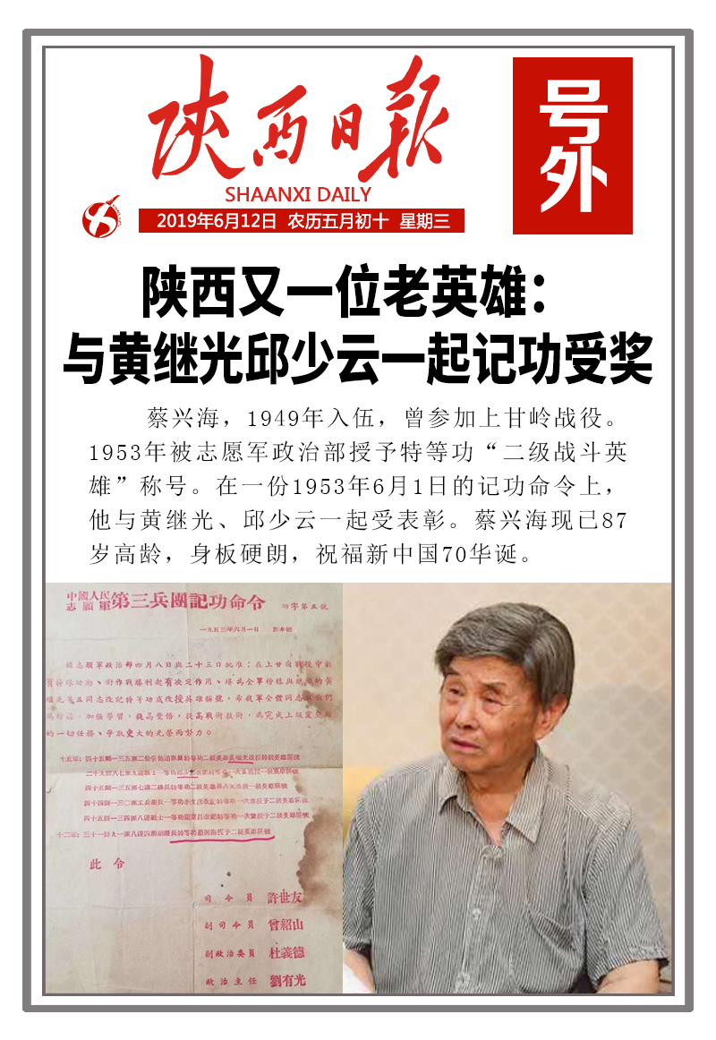 陕西87岁老英雄蔡兴海:与黄继光邱少云一起记功受奖 来源:陕西传媒网 作者:张丹 时间:2019-06-12