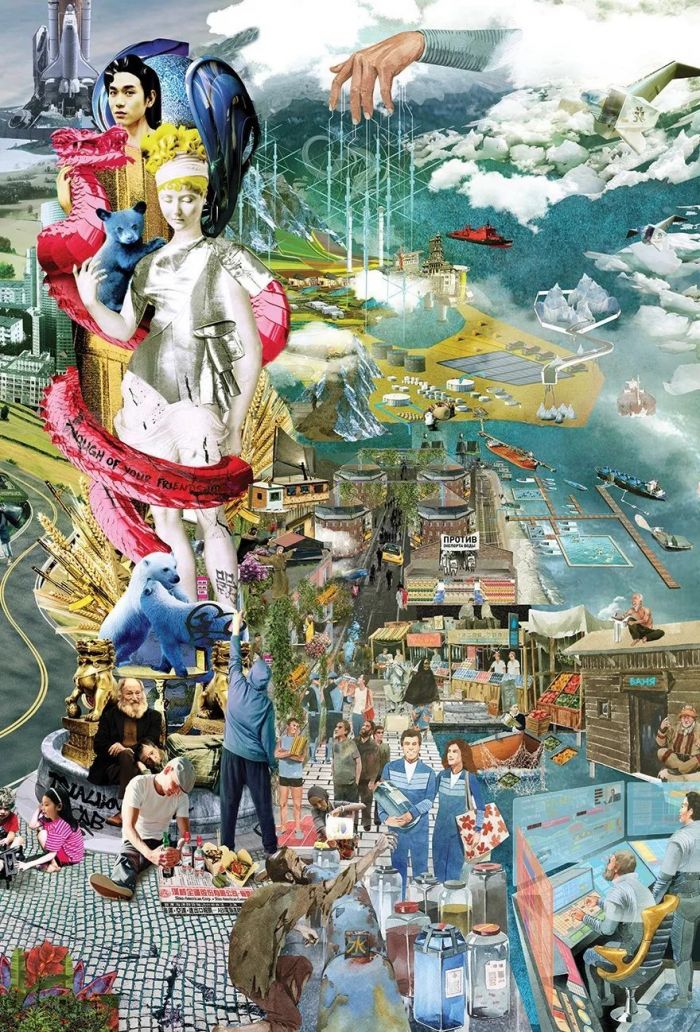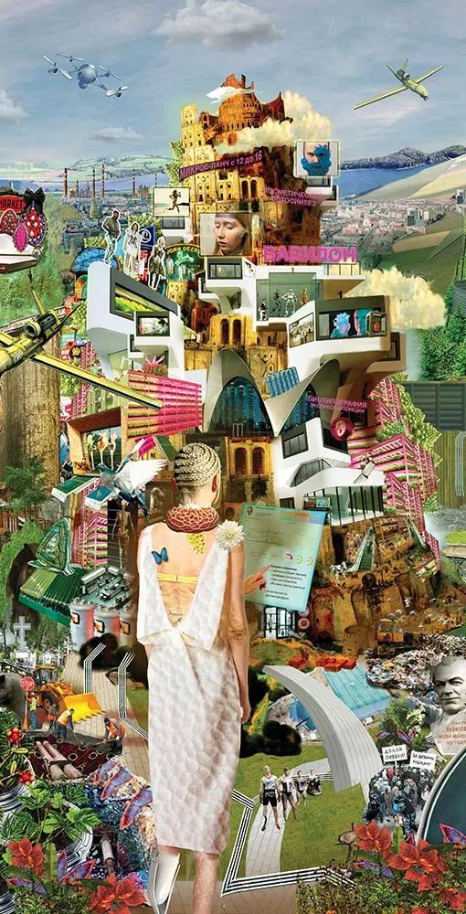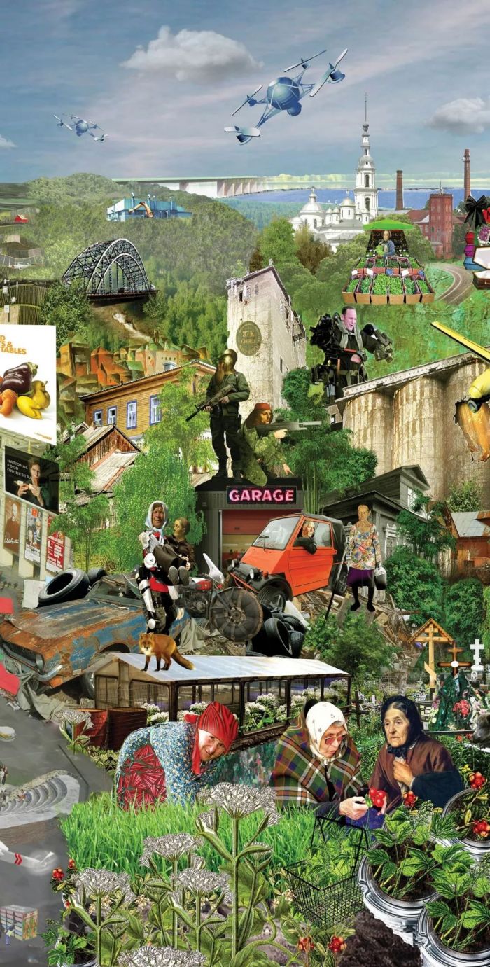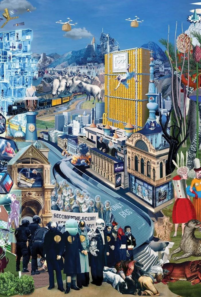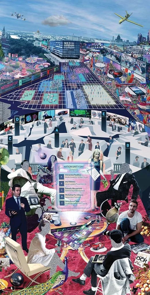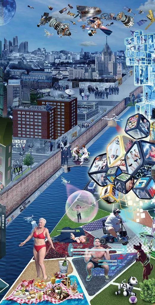 参与设计的各路研究员、设计师像前人那样高度关注科技革命、也怀揣明确的政治主张。但基于两个时代主要矛盾的不同,BIG FUTURE并不是那么激进、或极右,反而显得中立、含糊、模棱两可。或许,这就是当下这个复杂而飞速变化时代的最大魅力,只凭设计无法定义或解决所有问题,以革命的方式反对传统、与旧秩序决裂也不一定能迎来真正的理想世界。 但创意过程中的整合式思维和丰富想像空间完全可以实现一个个“可能世界”——这片充满各种不确定但始终没有一个答案的思想热土,旨在让更多人参与到关于未来的讨论。BIG FUTURE便是这样,以一系列“假如……,那么……?”开放性问题来激发人们以辩证的角度预言未来,而不只是憧憬。项目最后由11幅插画呈现,均以诙谐幽默的拼贴语言讲述了这群理想家们对社会秩序、技术伦理、能源优势三方面的想像。 1.预言理想社会 技术革命之于社会秩序的冲击是未来主义者的永恒话题,不论是百年前两次科技革命后沙俄的最终灭亡,还是今天互联网时代下俄罗斯民主制度所面临的挑战。