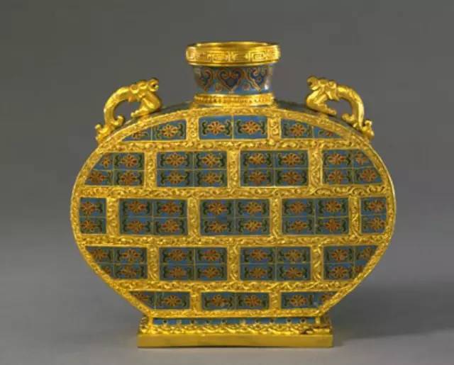 清乾隆 掐丝珐琅锦纹扁壶 景泰蓝制品色彩润泽鲜明,胎骨厚重坚实,掏丝整齐匀称、镀金灿烂光亮。主要制作流程为制胎、掐丝、点蓝、烧蓝、磨光、镀金六大工艺。