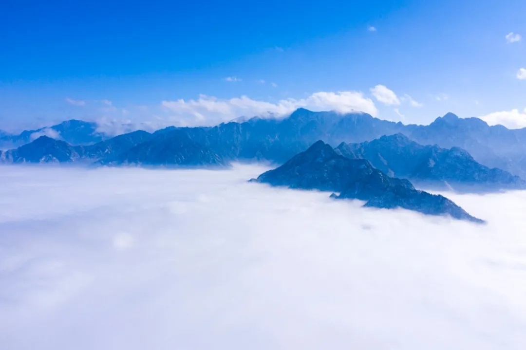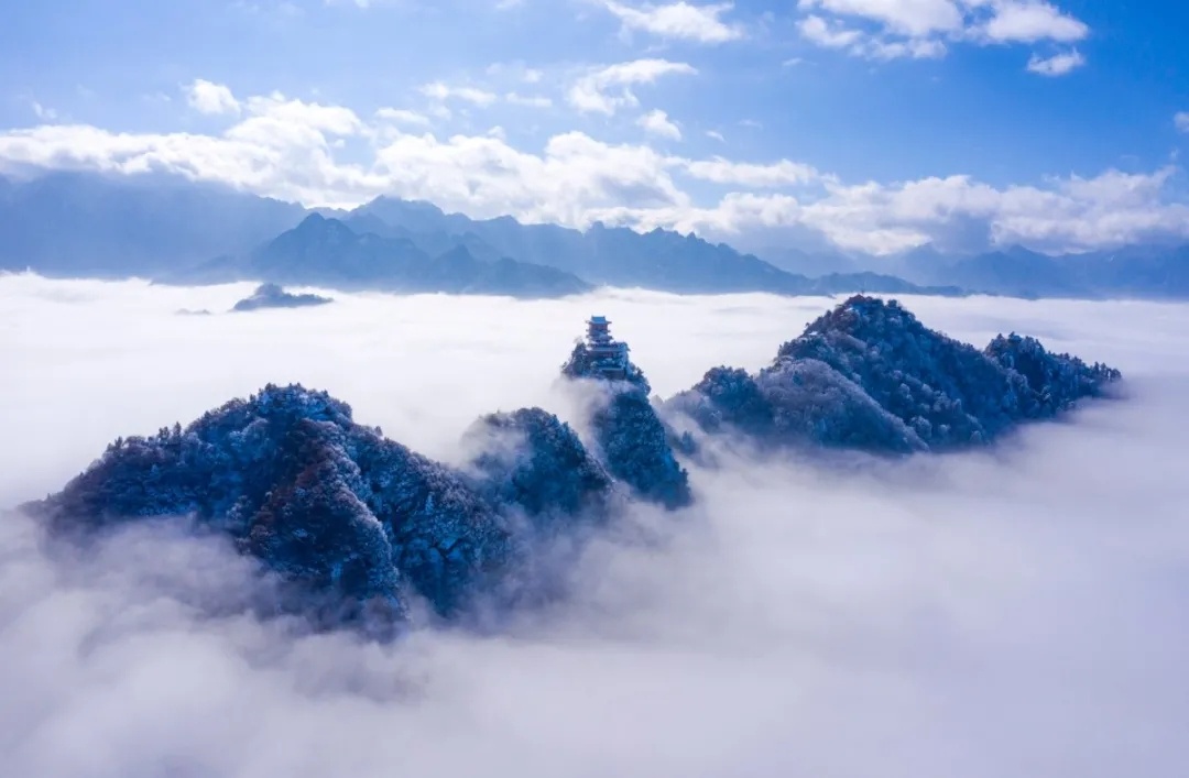 南五台山在陕西西安市长安区南五十里,终南山麓,南山佳丽之处,惟此最,又耀县东三里有北五台山,此云南者,别于耀县而言也。南五台山有明清以来大小庙宇40多处,建筑精巧,布局别致。山形峭拔,风景秀美。 云海翻涌腾细浪,浓雾缭绕系群山。云层或如惊涛骇浪,浪花飞溅;或在山谷间涌动,上下飞腾;或在山峰间缠绵徘徊、如梦似幻。雾气在山间的怀抱里凝聚,形成无边无际的云海,犹如冰雪奇缘的奇妙仙境,洁白得不含一丝杂色,让人不由得感叹大自然的神奇奥秘。