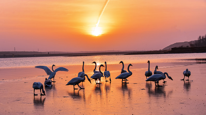连日来,在咸阳市三原县的清峪河湿地,10多只天鹅往来觅食,相约同欢。 近日,10多只天鹅大天鹅在三原县清峪河国家湿地公园或栖息徘徊,或飞舞盘旋,或悠然自得地在水库觅食、嬉戏,在清澈泛蓝的水面上勾勒出一幅人与自然和谐共存的美景。 近年来,随着三原县一批湿地保护恢复工程的实施,清峪河湿地面积持续扩大,湿地生态系统逐年增强,湿地生态环境持续不断改善,吸引天鹅在清峪河国家湿地公园内栖息越冬。 天鹅的出现,吸引来众多摄影爱好者和群众竞相观看,成为咸阳市冬季的一大景观。