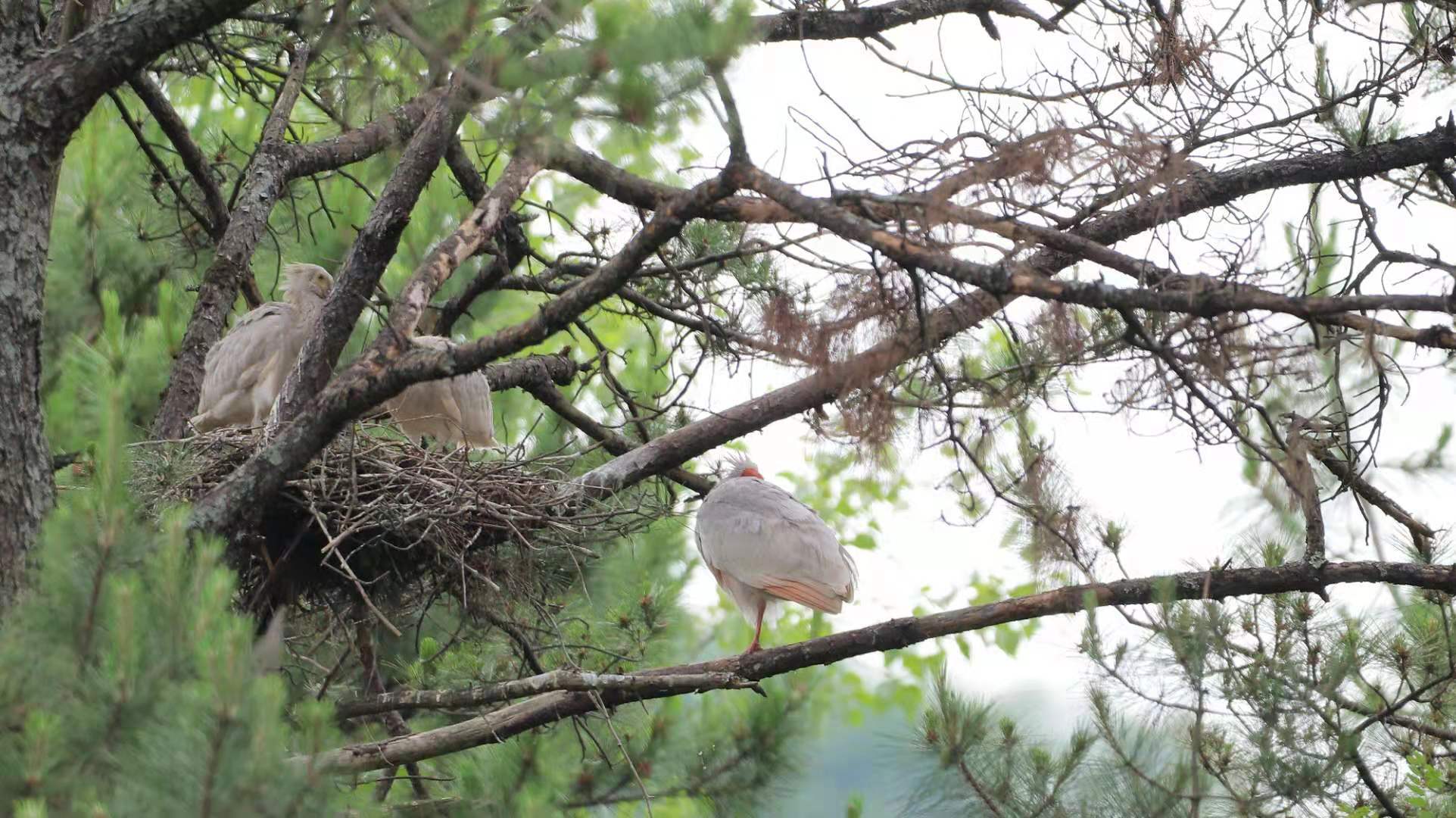 朱鹮筑巢抚育幼鸟。贾海洋 摄