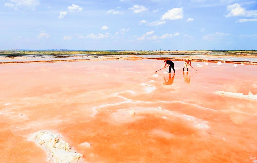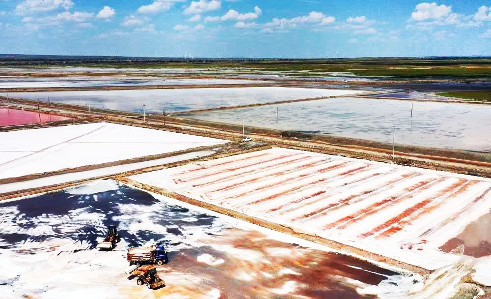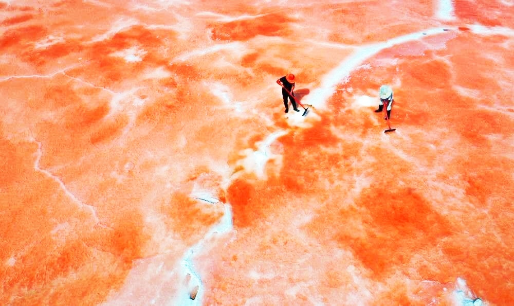 8月7日,盐厂员工在盐池里忙碌(无人机照片)。陶明 摄
